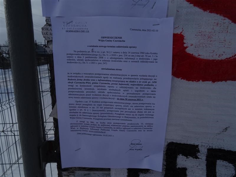 W Czeremsze Wsi rozpoczął się protest przeciwko planom budowy na zachód od miejscowości dużej fermy drobiu (8 dużych kurników). Mieszkańcy obawiają się przykrych zapachów, hałasu od ciężkiego transportu i jego wpływu na stan lokalnych dróg i budynków, degradacji okolicznej przyrody. Inwestor i właściciel kilkunastohektarowej działki uważa, że wszystkie parametry, które mają być spełnione wg prawa są spełnione. Ponadto budynki inwentarskie i technologia produkcji będą bardzo nowoczesne. Władze Gminy Czeremcha wszczęły postępowanie administracyjne, w sprawie wydania decyzji o środowiskowych uwarunkowaniach zgody na realizację tej inwestycji. Jest to konieczne dla uzupełnienia raportu o oddziaływaniu na środowisko tej fermy. Ustalono termin załatwienia sprawy i wydania decyzji do 30 czerwca 2021 roku.