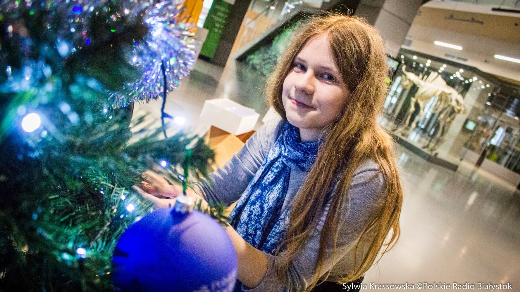 Uczennice ubierały choinkę w Rezerwacie Pokazowym Żubrów w Białowieży.