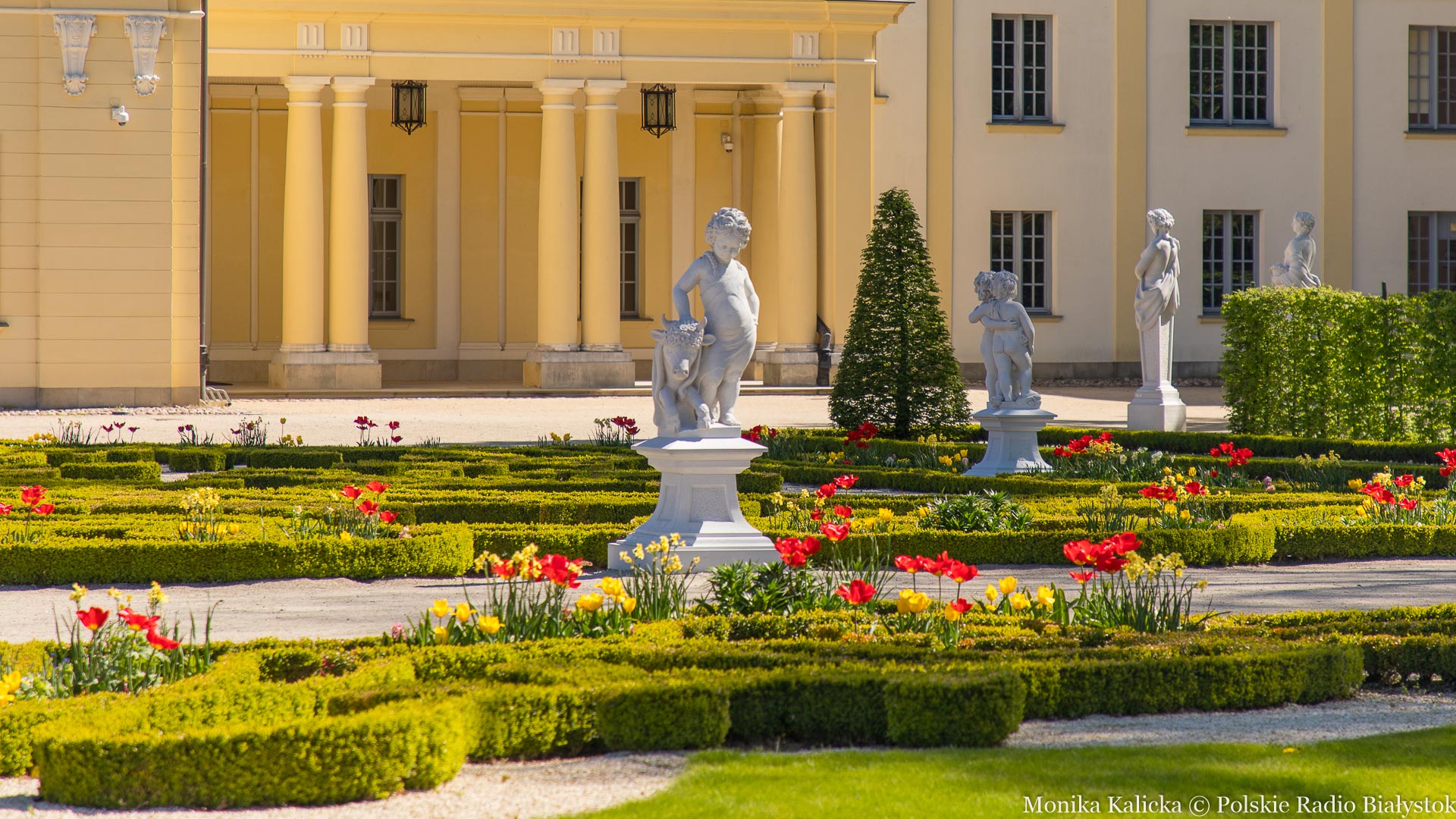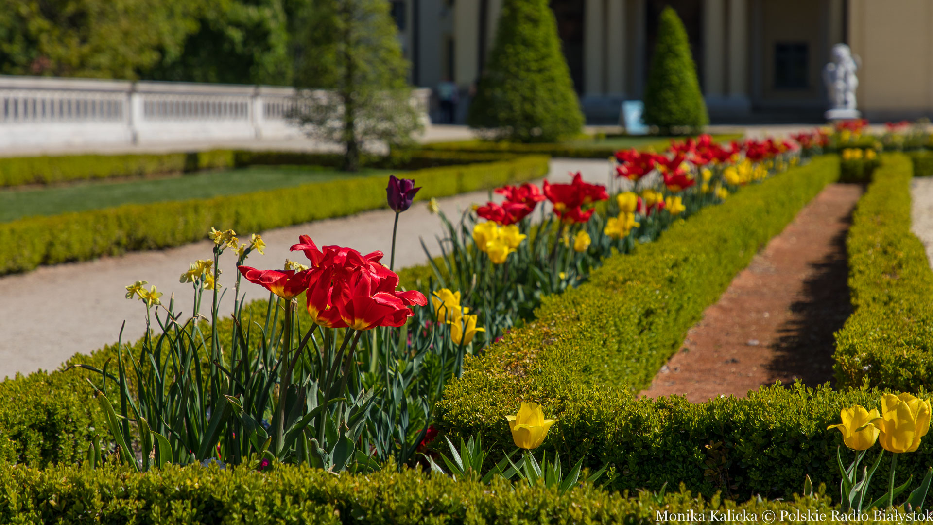 Początek maja to czas kwitnienia wielu, zwłaszcza cebulowych, wiosennych kwiatów. Alejki przed pałacem zachwycają feerią barw tulipanów, żonkili, stokrotek, narcyzów, hiacyntów i niezapominajek.