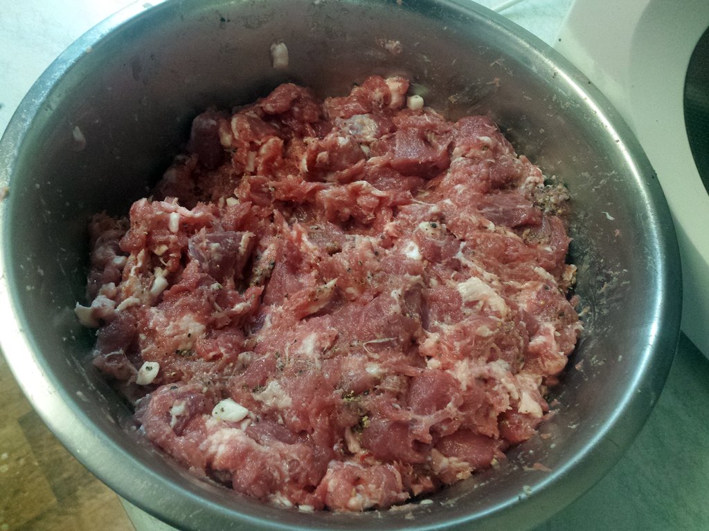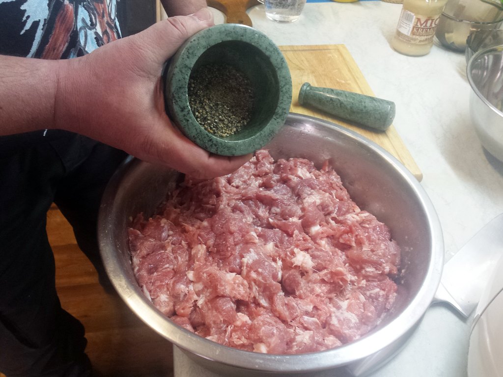 Mięso przygotowujemy dzień przed nadziewaniem go do jelit. Część mięsa z elementami tłustymi i słoniną mielimy przez sitko o grubych oczkach. Drugą część kroimy w dość dużą kostkę. W szklance zimnej wody rozpuszczamy sól (na 5 kg mięsa 6 łyżeczek soli i 3 łyżeczki cukru). Wlewamy to do miski z mięsem. Długo mieszamy, aż pojawi się tzw. klej. Na całą noc odstawiamy do lodówki. Na drugi dzień oddajemy czarny pieprz i gorczycę (zmiażdżoną w moździerzu). Jeśli mięso jest za mało doprawione, to znowu można dodać wodę z rozpuszczoną solą i cukrem. Następnie mięsem nadziewamy wymoczone wcześniej jelita. Tak przygotowaną kiełbasę gotujemy lub pieczemy. Podajemy z sosem.