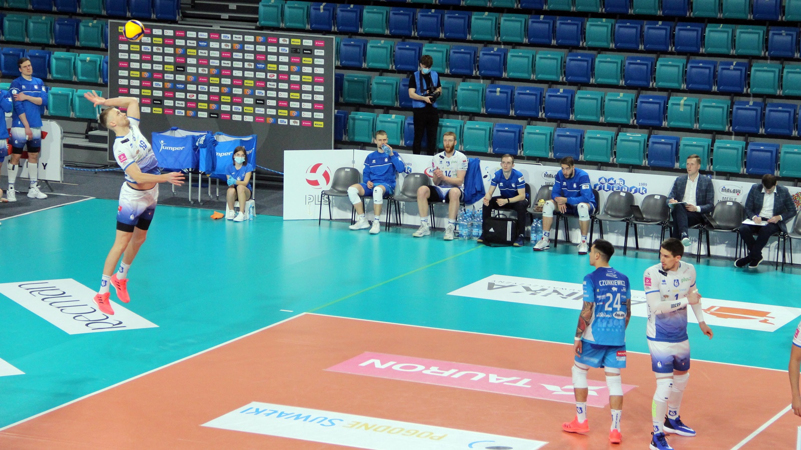 Ślepsk Malow Suwałki: Waliński (9), Rousseaux (12), Bołądź (17), Takvam (6), Sapiński (5), Tuaniga (1), Czunkiewicz (libero) oraz Szwaradzki, Rudzewicz.