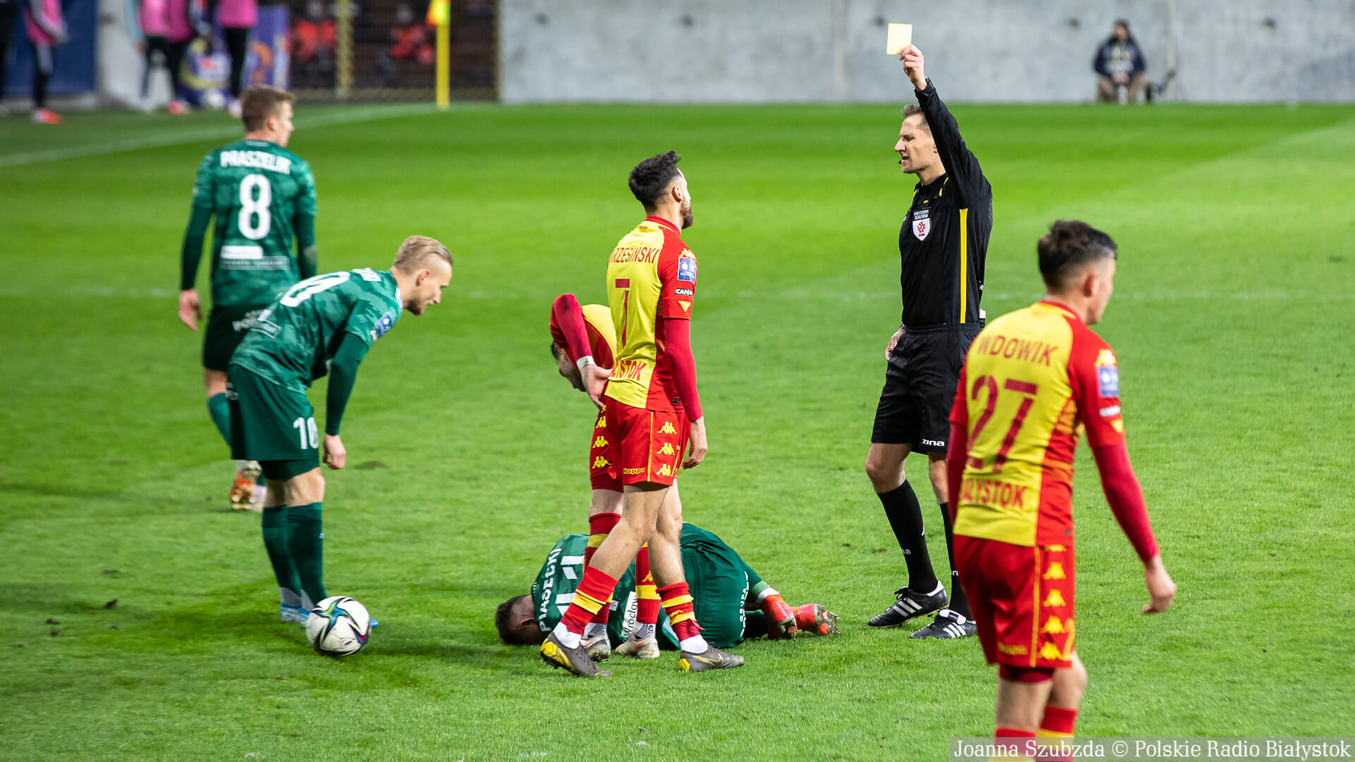 Ostatnie 10 min. meczu Jagiellonia Białystok grała w osłabieniu po drugiej żółtej kartce i w konsekwencji czerwonej dla Macieja Makuszewskiego.
