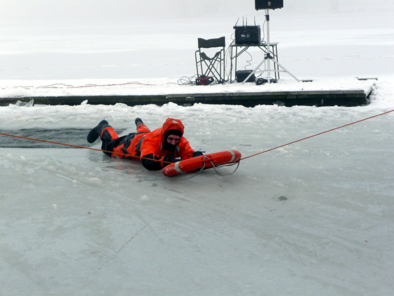 Obserwowali je uczniowie, którzy mają jeszcze ferie. Uczestnicy pokazów mogli włożyć specjalny kombinezon i wskoczyć do lodowatej wody. Na pomoc ruszali im ratownicy, ostrożnie poruszając się po lodzie.