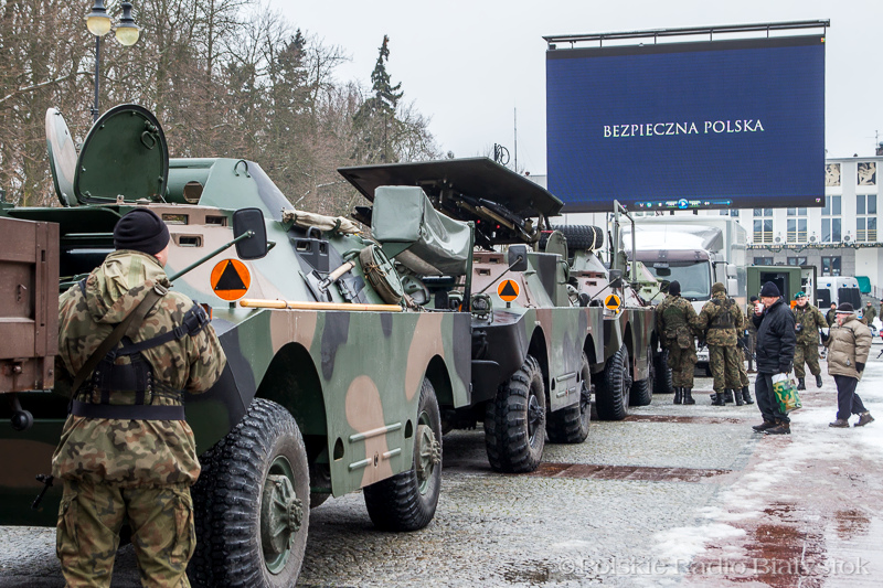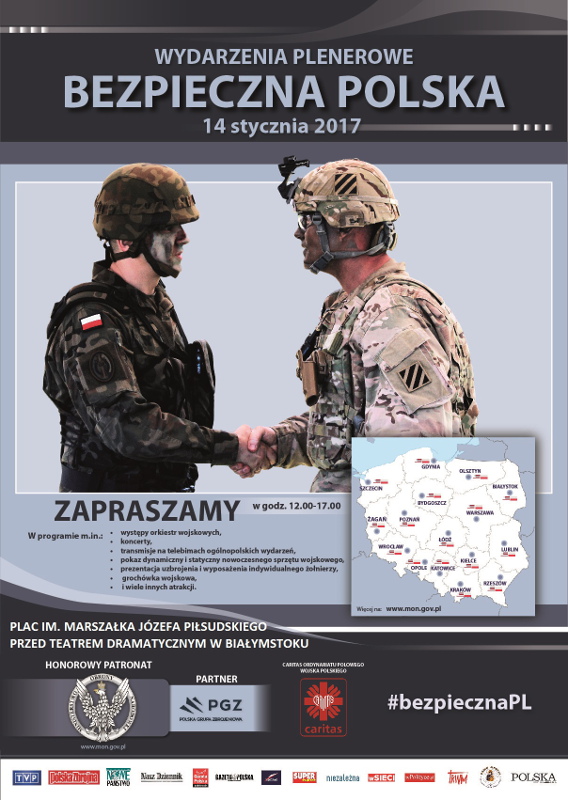 W Białymstoku na placu przed Teatrem Dramatycznym od 12:00 do 17:00 będzie można oglądać sprzęt wojskowy, m.in. wyrzutnię "Malutka", czołg Leopard, Rosomaka, wozy rozpoznawcze, bojowe, wykrywania skażeń i pojazd patrolu saperskiego. O 14:00 planowana jest transmisja uroczystości powitania w Polsce wojsk amerykańskich z Żagania.