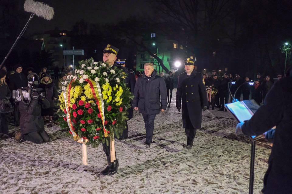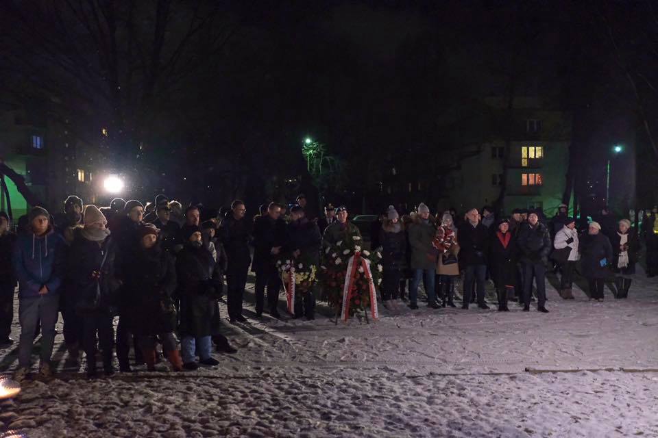 Po kilkudziesięciu minutach uczestnicy obu tych spotkań przeszli pod pomnik bohaterów powstania w getcie, spotkało się tam ok. stu osób. Wieńce i kwiaty składane były m.in. przez przedstawicieli władz państwowych, samorządowych i partie polityczne. Odczytywano nazwiska ofiar akcji lutowej oraz fragmenty pamiętnika młodego Żyda Dawida Szpiro, który m.in. opisuje życie w getcie.