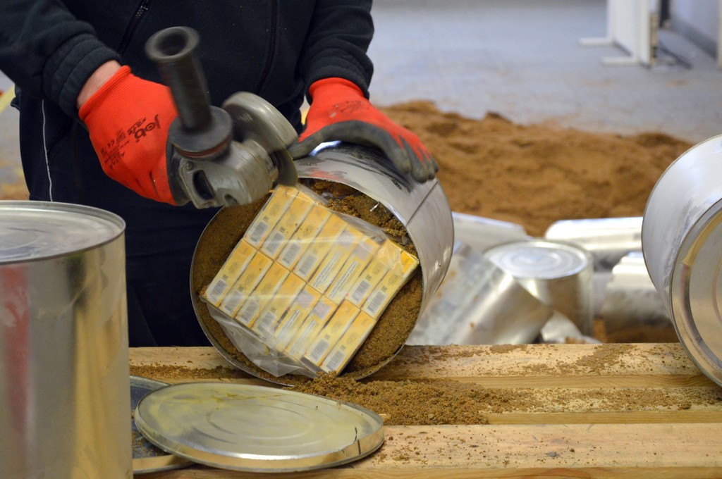 Okazało się, że w każdej z nich ukryto po 80 paczek papierosów. W puszkach był też piasek, który miał je prawdopodobnie dociążać do wagi deklarowanego ładunku, czyli żywicy syntetycznej. Rozładunek, rozcinanie puszek i przeliczanie towaru zajęło prawie dwie doby. Okazało się, że w sumie w tirze było 125 tys. paczek papierosów ze znakami białoruskiej akcyzy.