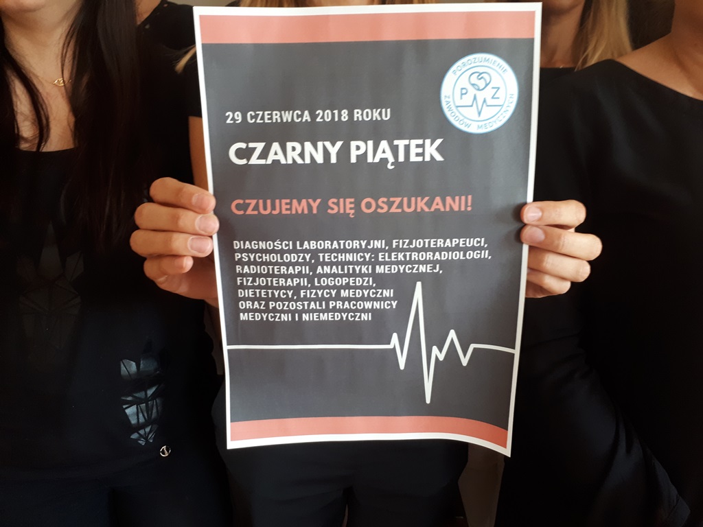 W kilkuset szpitalach w Polsce pracownicy medyczni zorganizowali Czarny Piątek. Przyszli do pracy w czarnych koszulkach. W budynkach rozwiesili plakaty ze swoimi postulatami i rozdają ulotki.
