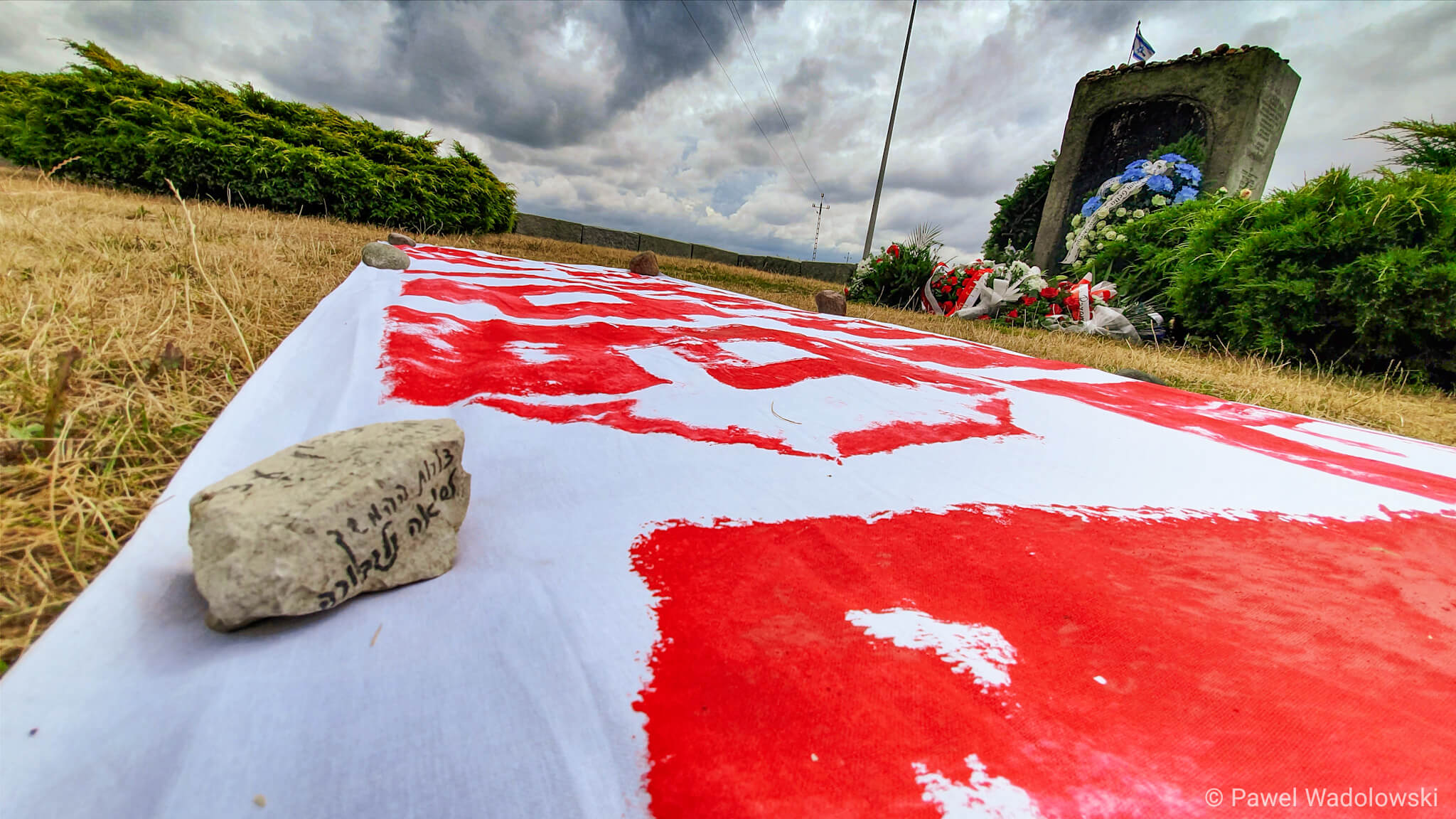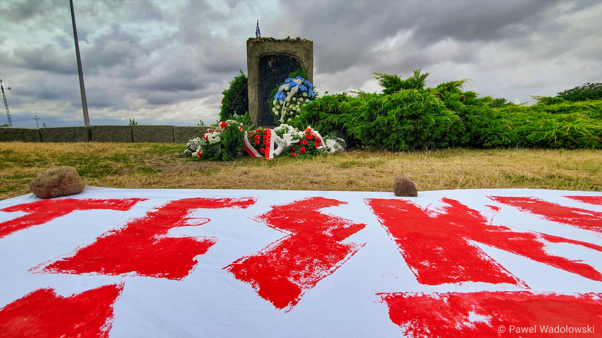 Podobny, ale już na płachcie materiału, położony jest przy pomniku upamiętniającym zbrodnię sprzed 78 lat. Policjanci ustalają, kto jest autorem tych napisów.