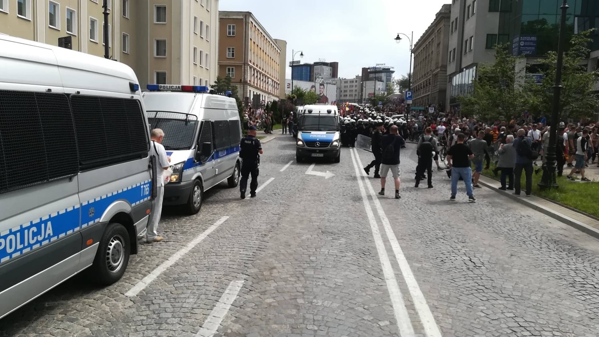 Kibice odspiewali hymn Polski na ul. Mickiewicza. Tu na razie stoi #MarszRownosci w #Bialystok