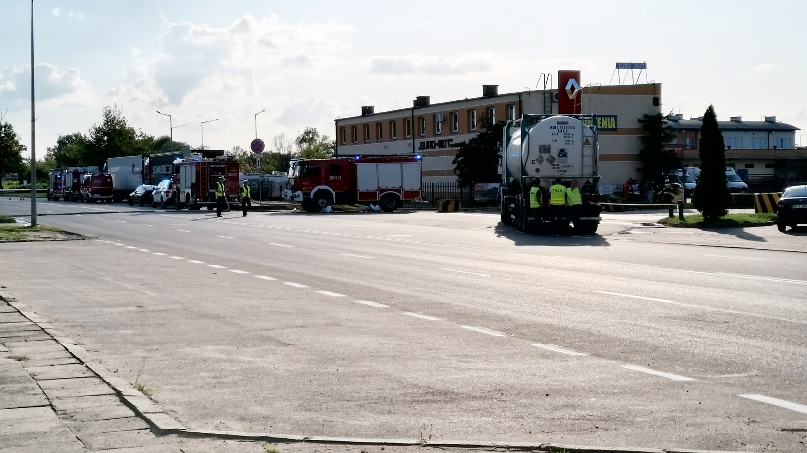 Wyciek jest w kilku miejscach, w związku z tym podjęliśmy decyzję o tym, że zabezpieczymy to miejsce, czyli to co wycieka, to my natychmiast przechwytujemy, sorbujemy odpowiednimi substancjami. Też całą atmosferę wokół pojazdu monitorujemy naszymi przyrządami i też zabezpieczyliśmy w postaci kurtyn wodnych, które przechwytują ewentualne opary. Zabezpieczone są też wszystkie studzienki, do których na szczęście nic się wcześniej nie dostało.