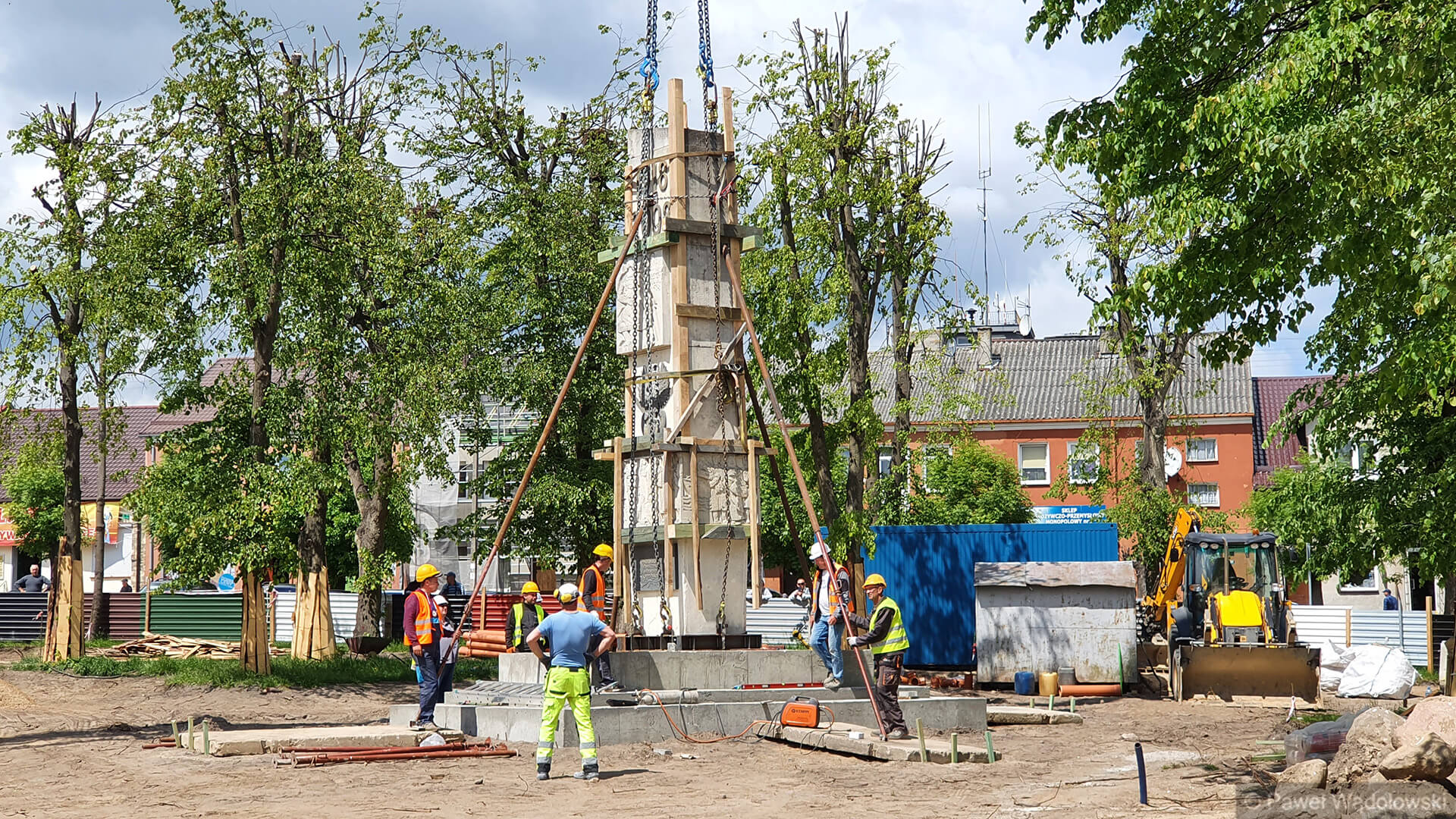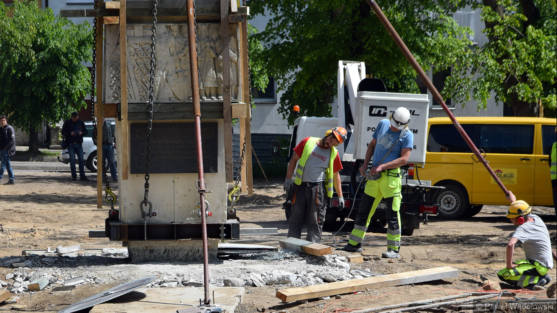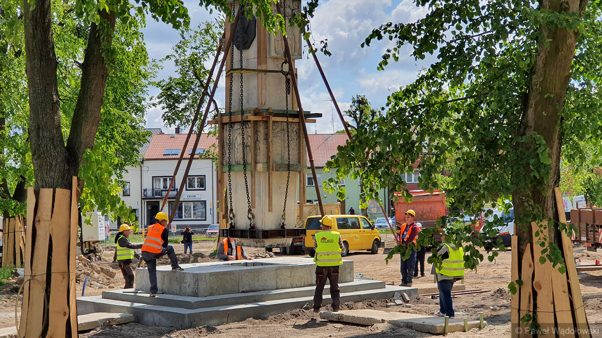 - Nie wiemy jak się ten pomnik zachowa podczas transportu. Mamy dźwig, który może podnieść 160 ton i piłę do przecięcia pomnika. Lekko napinamy liny i podcinamy cokół. A potem przenosimy w nowe miejsce. Pomnik waży 20 ton i jest z piaskowca. Zrobiliśmy specjalne zabezpieczenia, żeby się nie rozleciał - mówi Waldemar Skrodzki z firmy, która przebudowuje kolneński park.