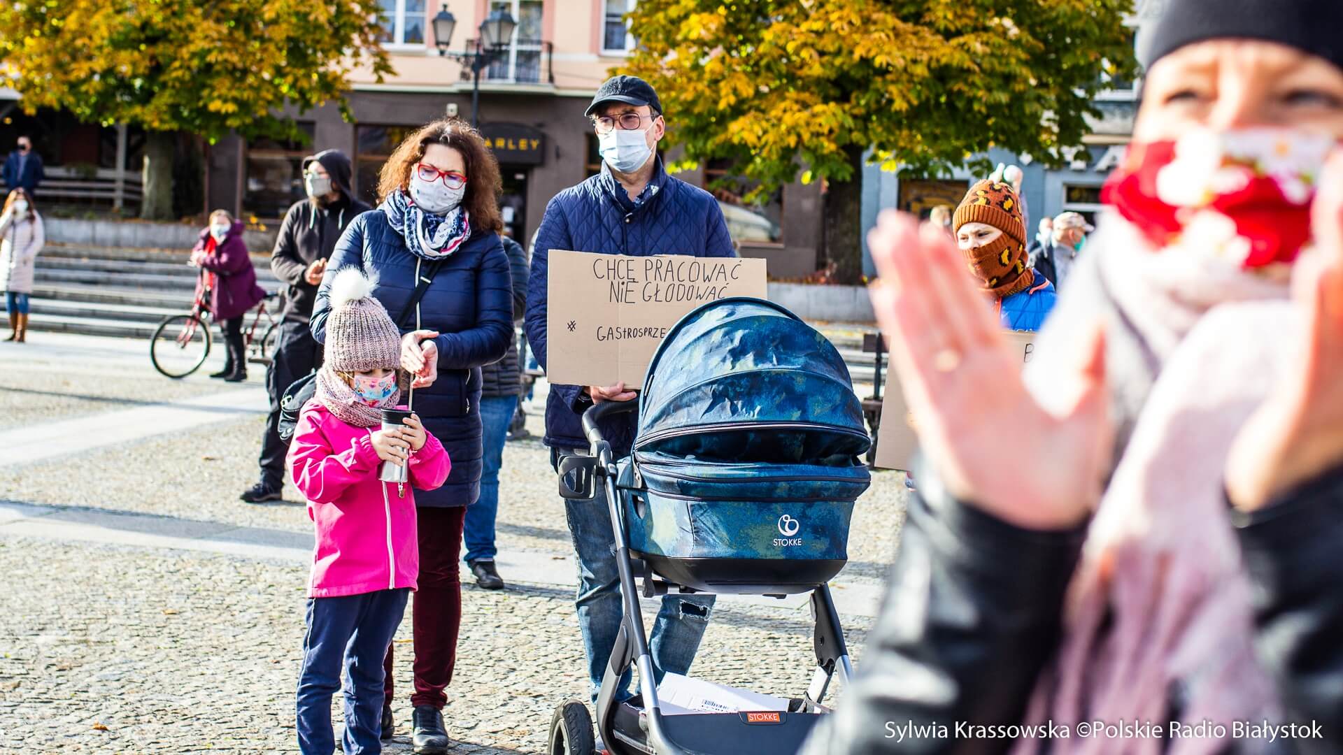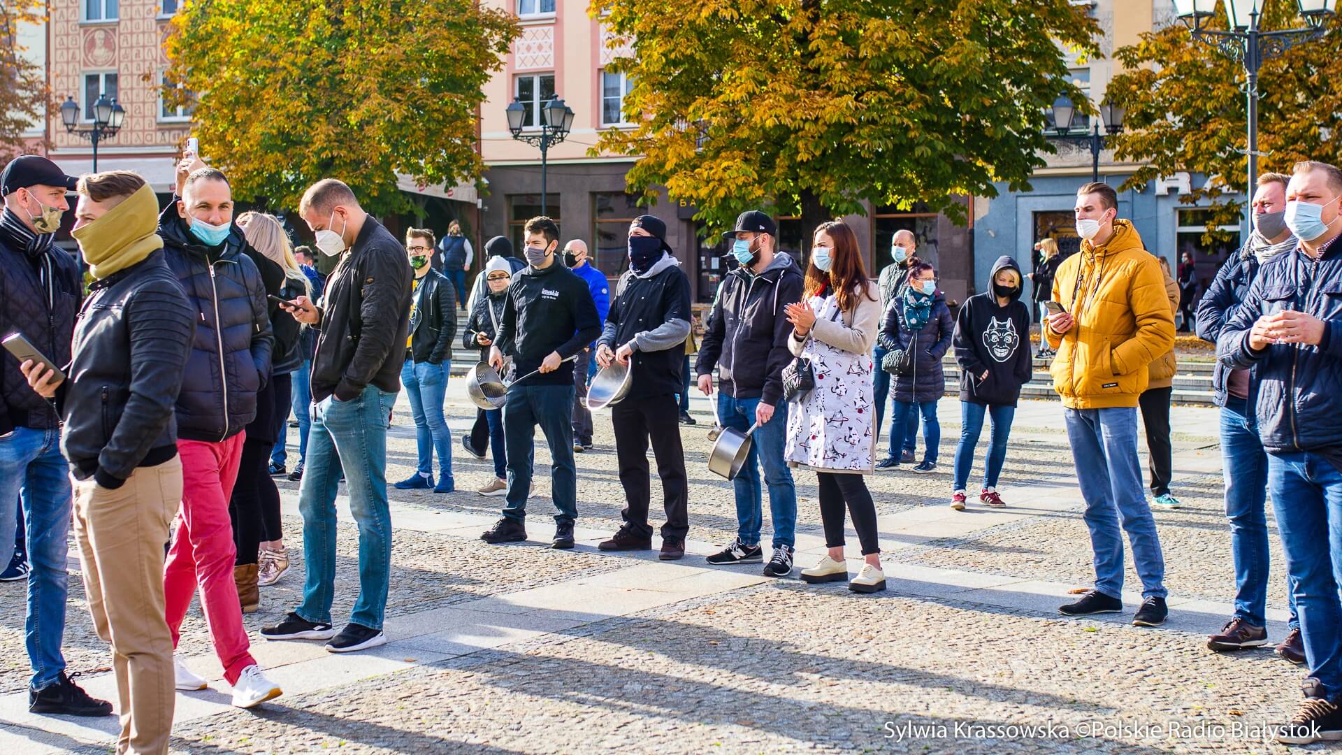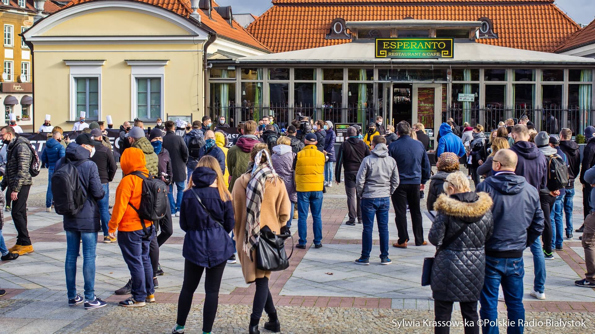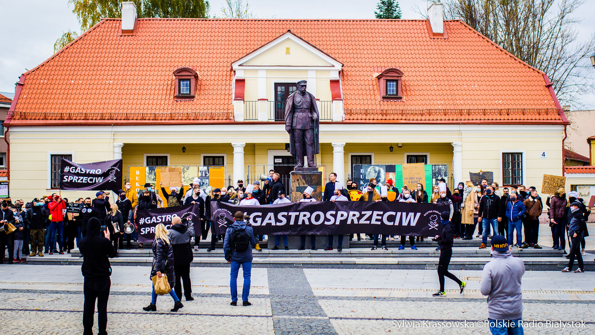 W samo południe pod hasłem "#gastrosprzeciw" na Rynku Kościuszki w Białymstoku spotkało się kilkaset osób, przede wszystkim pracujących w gastronomii, ale też branż współpracujących, by zaprotestować wobec obostrzeń, jakie nałożył na gastronomię rząd w związku z pandemią koronawirusa.