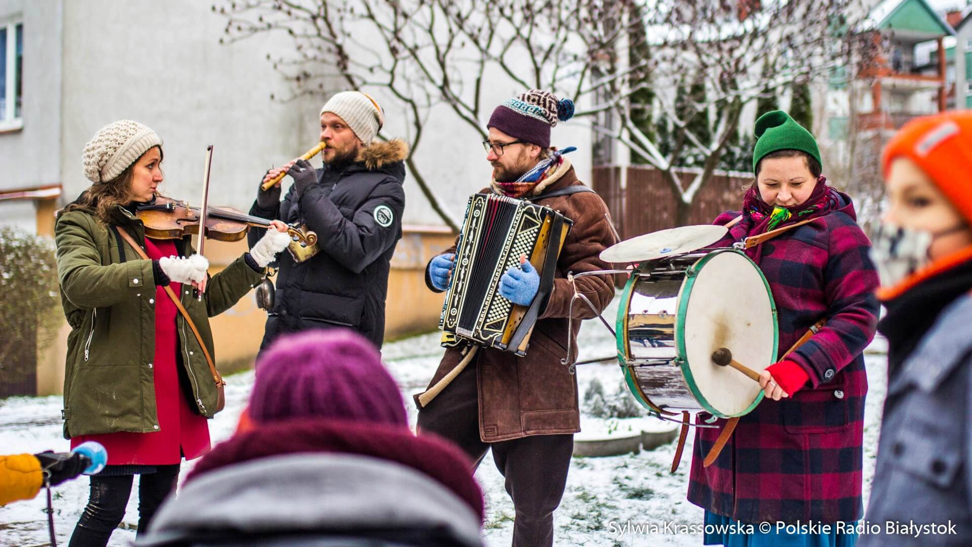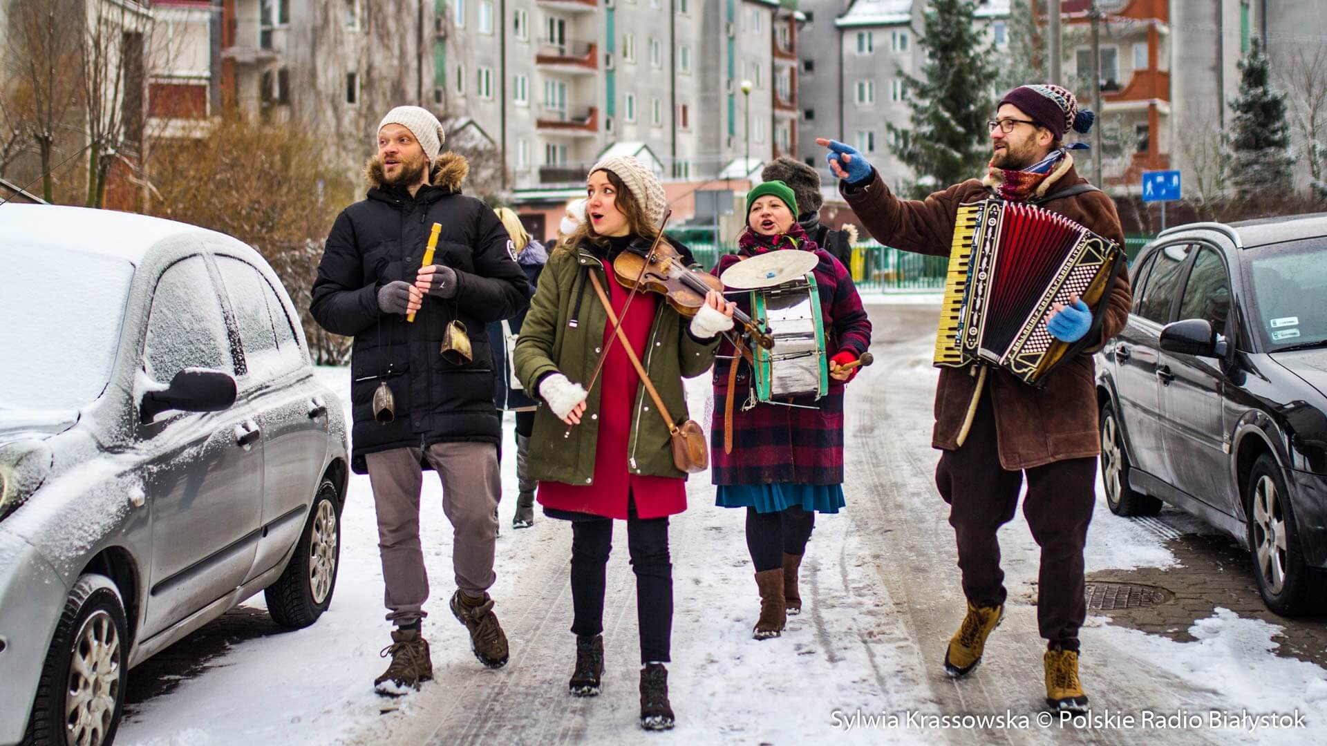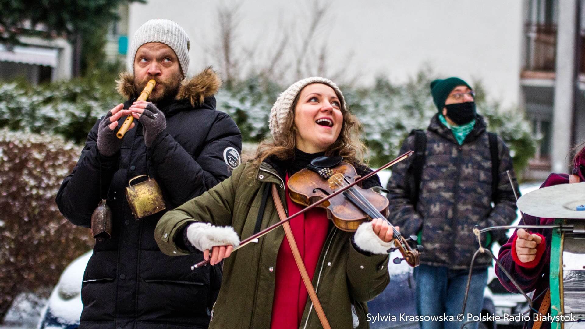 W zimowej, śnieżnej scenerii w niedzielę (13.12) Kapela Batareja muzykowała świątecznie pod balkonami mieszkańców białostockich osiedli: Nowe Miasto i Piaski.