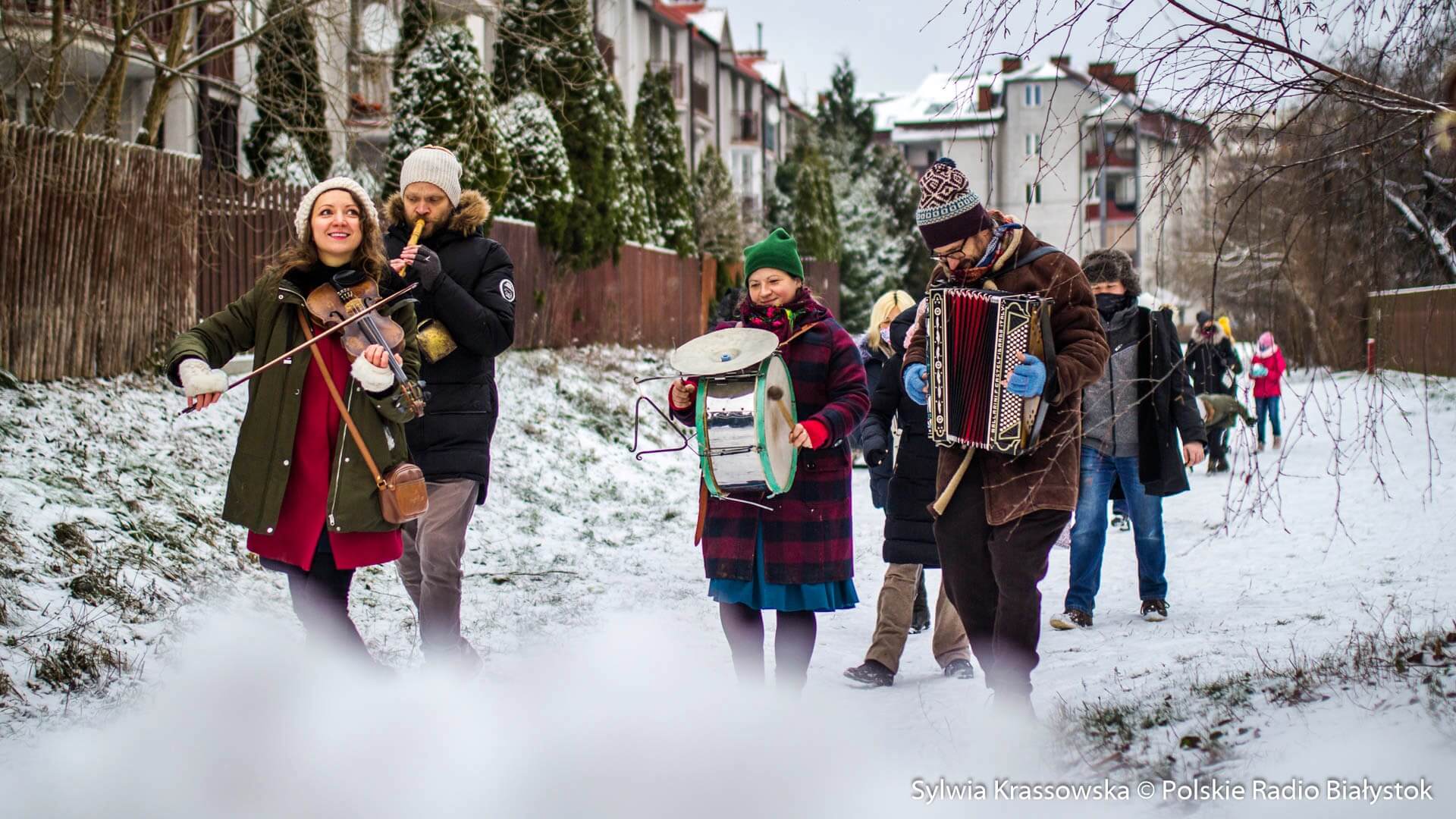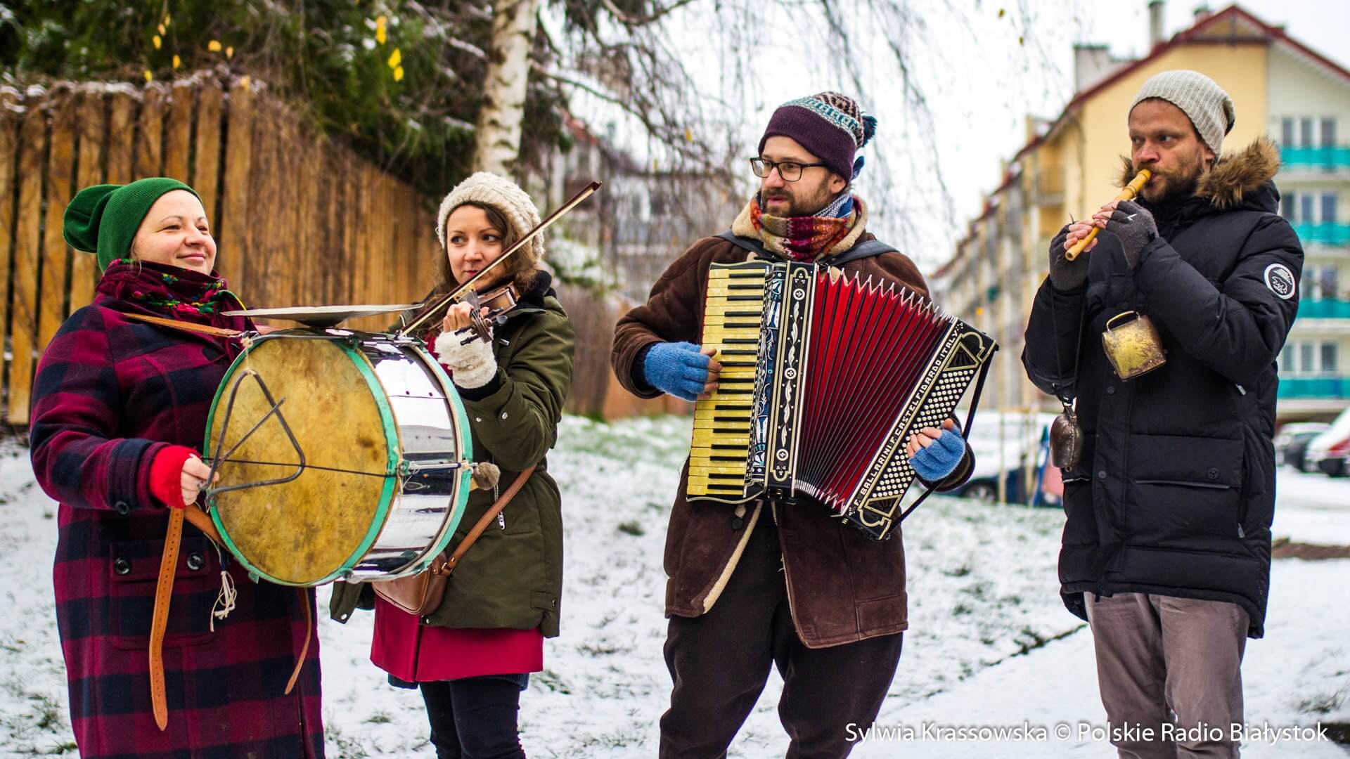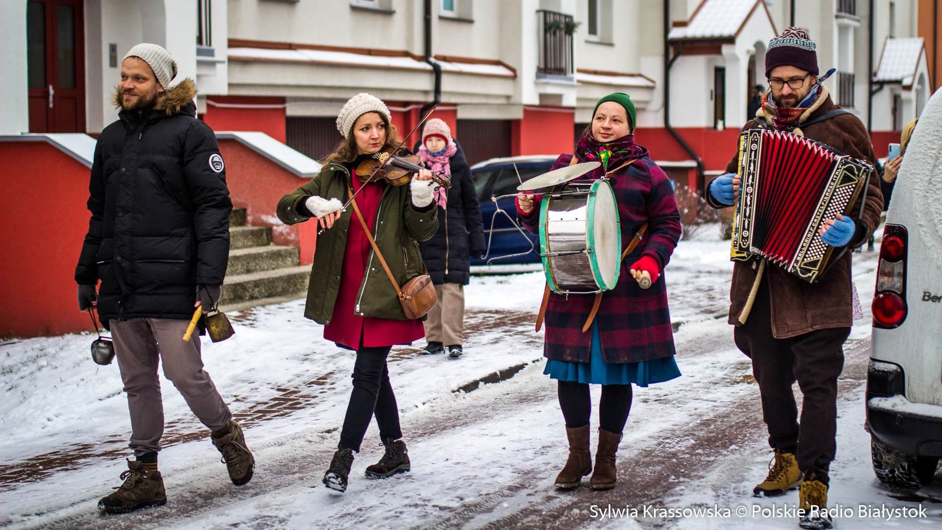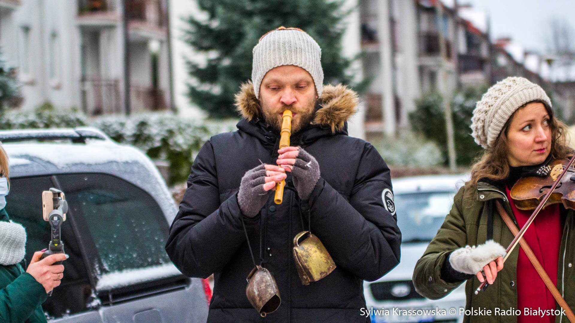 W zimowej, śnieżnej scenerii w niedzielę (13.12) Kapela Batareja muzykowała świątecznie pod balkonami mieszkańców białostockich osiedli: Nowe Miasto i Piaski.