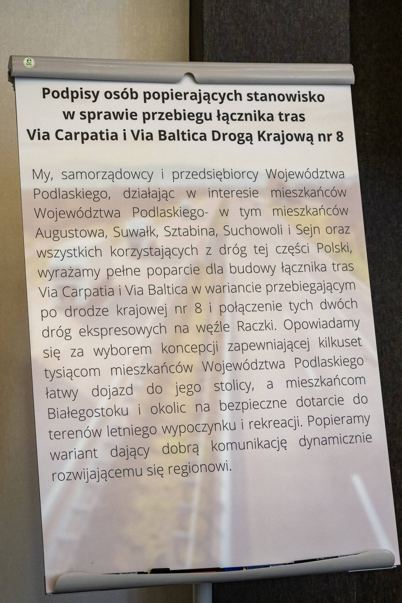 Samorządowcy i przedsiębiorcy z Suwalszczyzny podpisali stanowisko popierające przebieg drogi S16 przez Augustów a nie Ełk. Droga ma być łącznikiem pomiędzy budowanymi drogami Via Carpatia i Via Baltica.