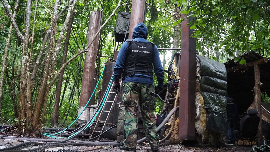 Funkcjonariusze KAS ustalili, że w lesie w okolicach wsi Rudnica w powiecie białostockim działa bimbrownia, w której produkowany jest nielegalny alkohol na dużą skalę. Mundurowi zaskoczyli nadzorującego produkcję 40-letniego mężczyznę, mieszkańca Białegostoku.