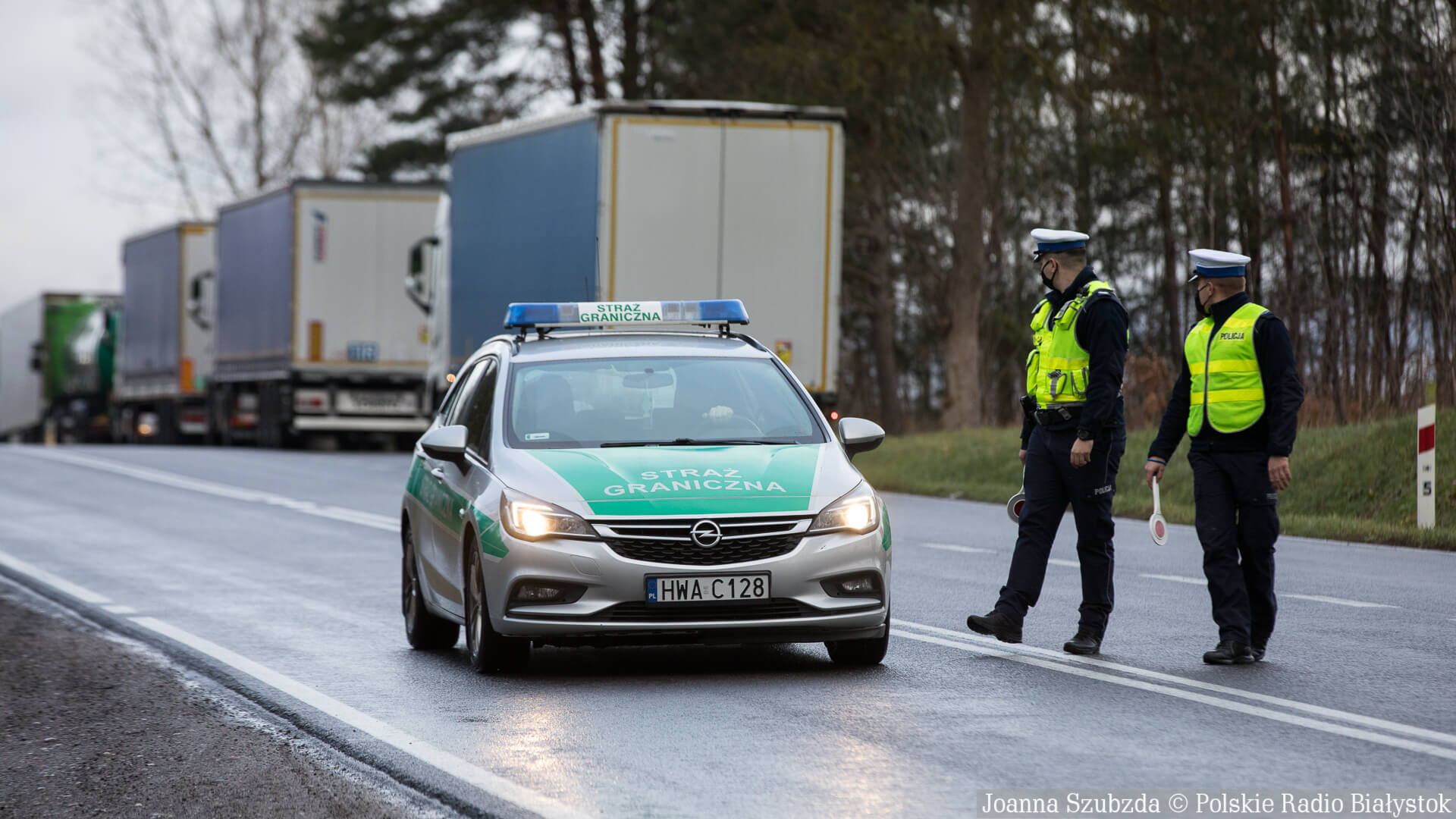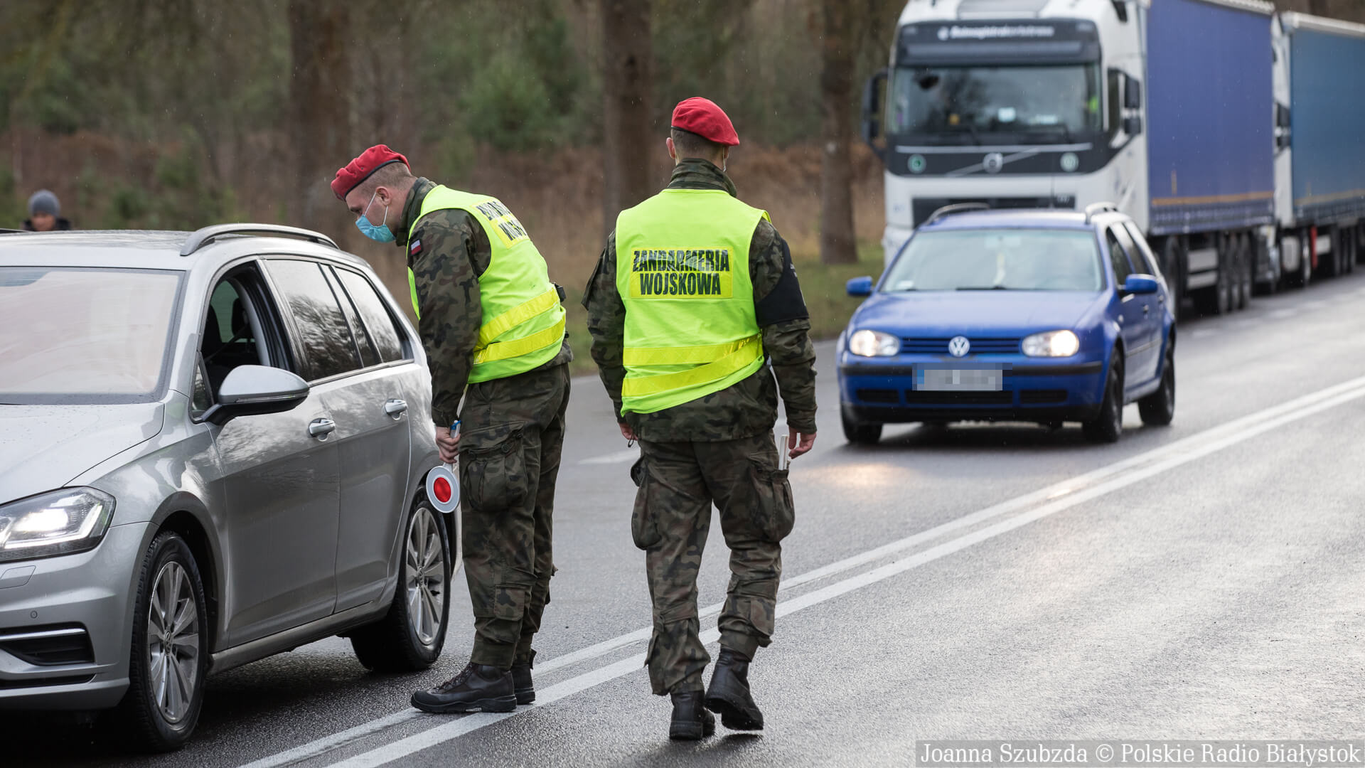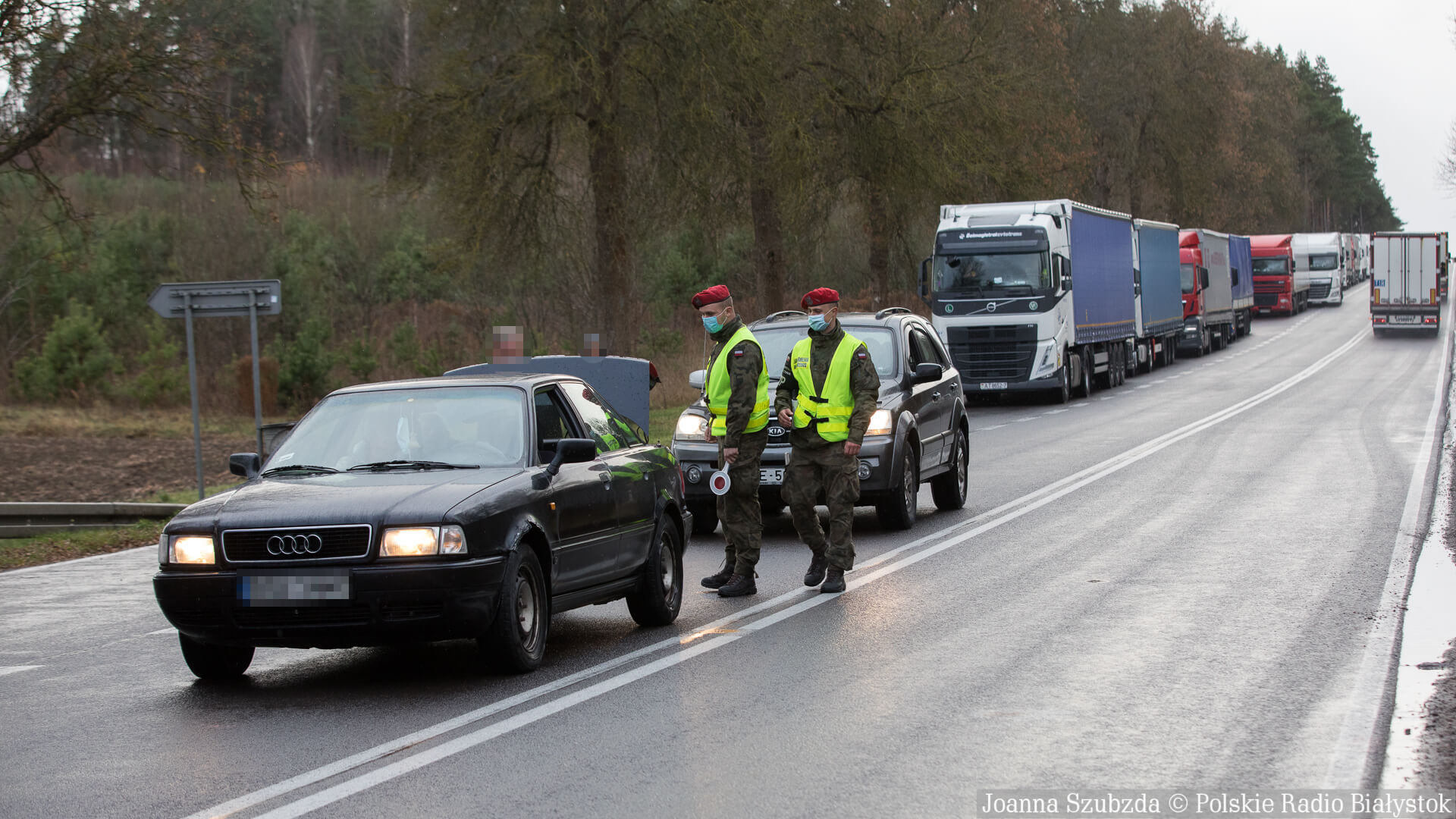 dźwięk do pobraniaPolicjanci i żandarmeria wojskowa kontrolują auta wjeżdżające do Kuźnicy - relacja Wojciecha Szubzdy | Pobierz plik.