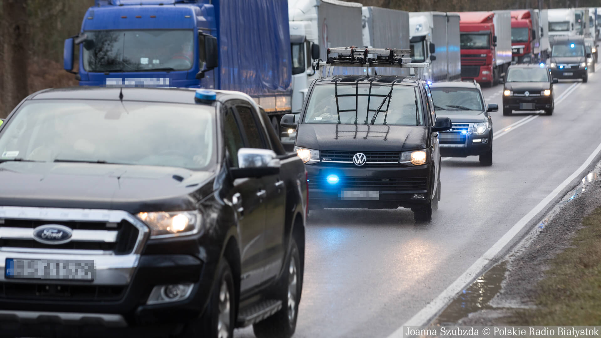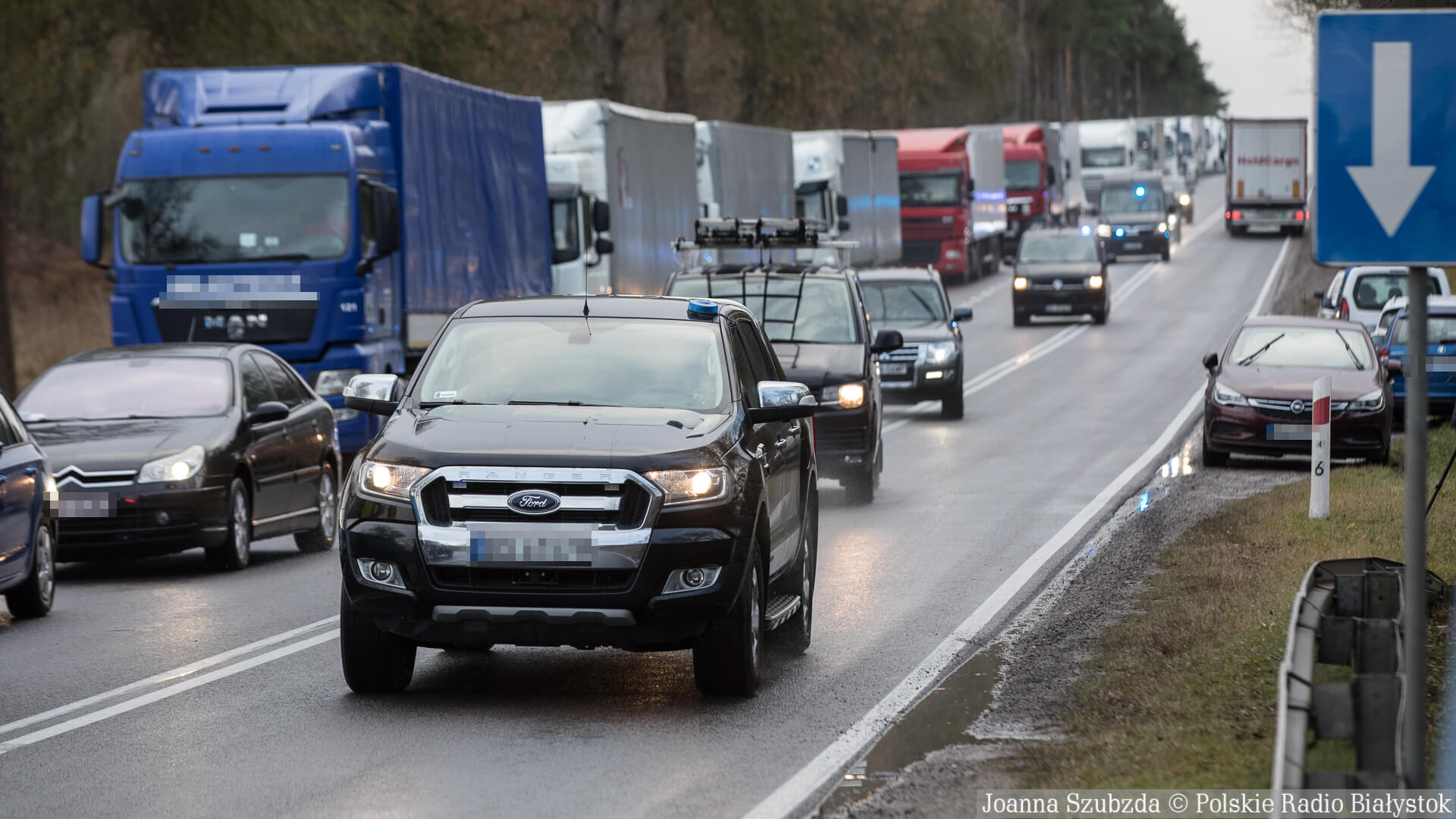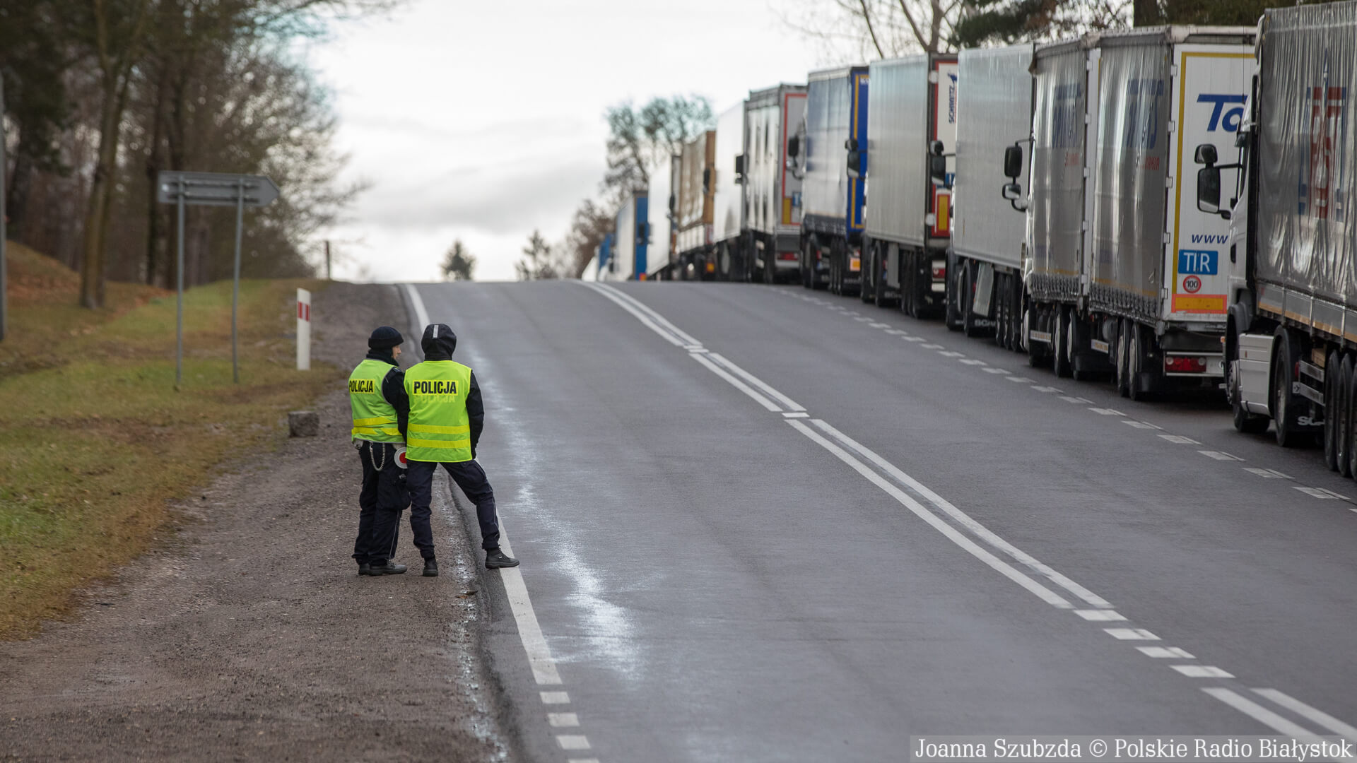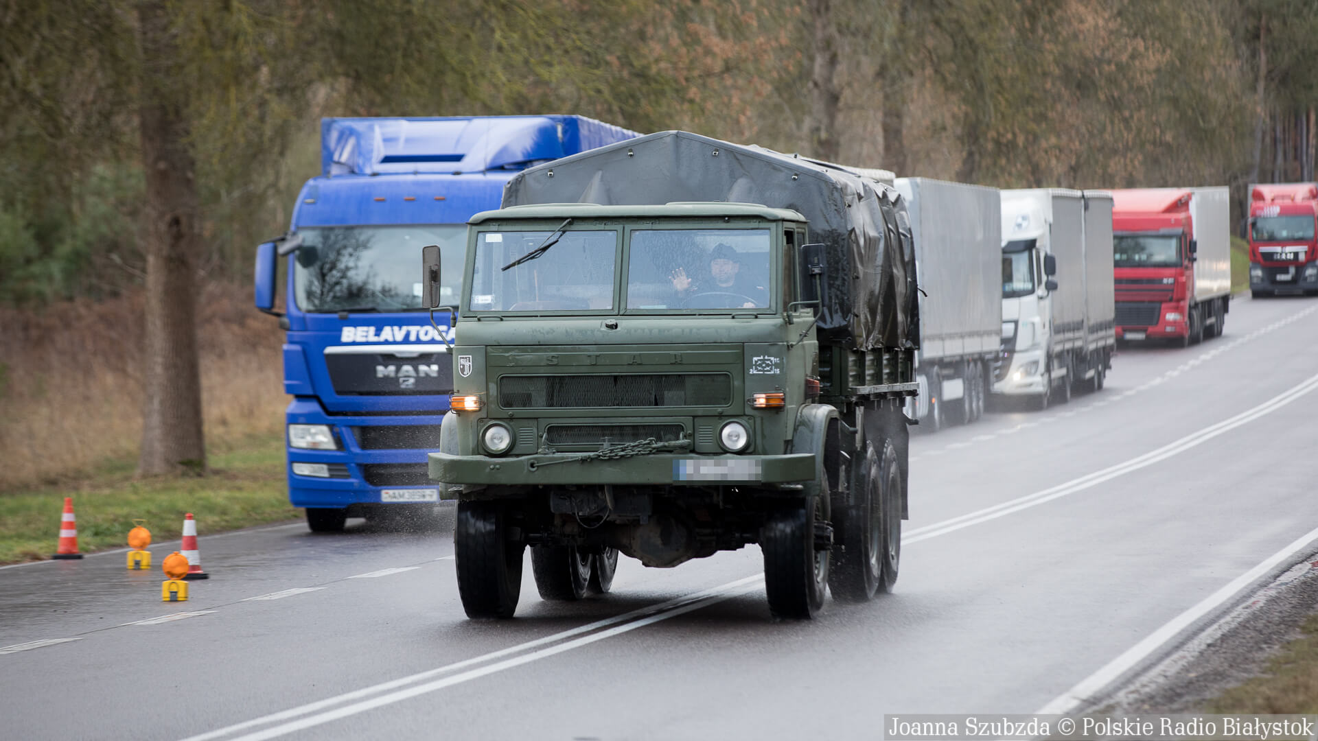 Ruch na drodze do Kuźnicy jest niewielki. Większość samochodów ma białoruskie numery rejestracyjne. Jest też długa kolejka tirów, która stoi na poboczu.