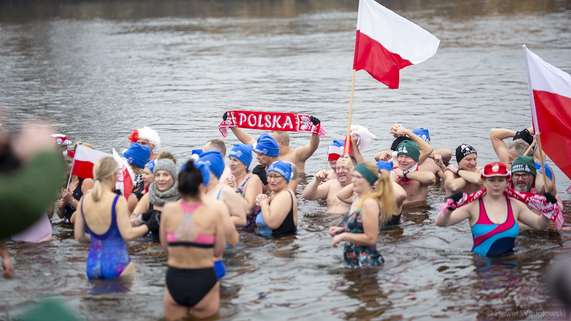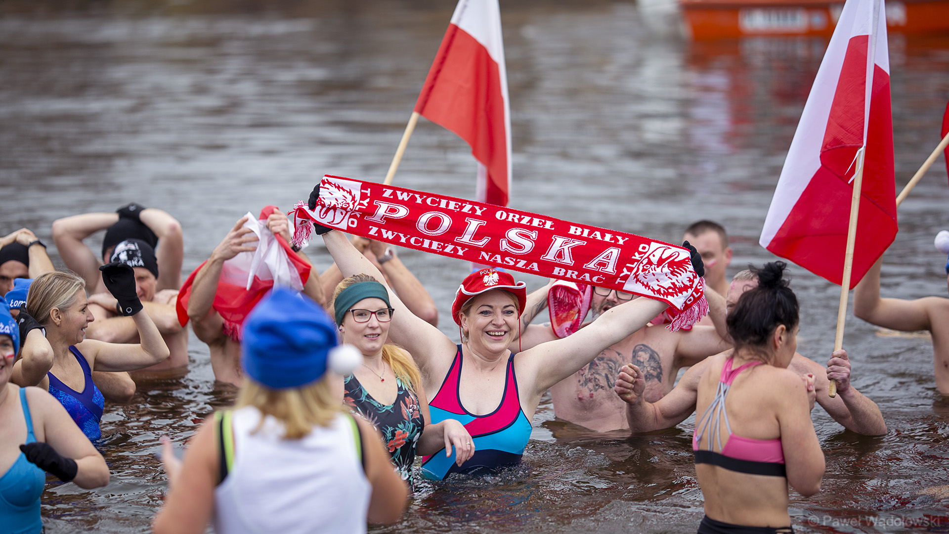 Do wody weszli na plaży miejskiej, przy moście Hubala. Mieli na sobie biało-czerwone ubrania, ale także flagi i szaliki z napisem Polska.