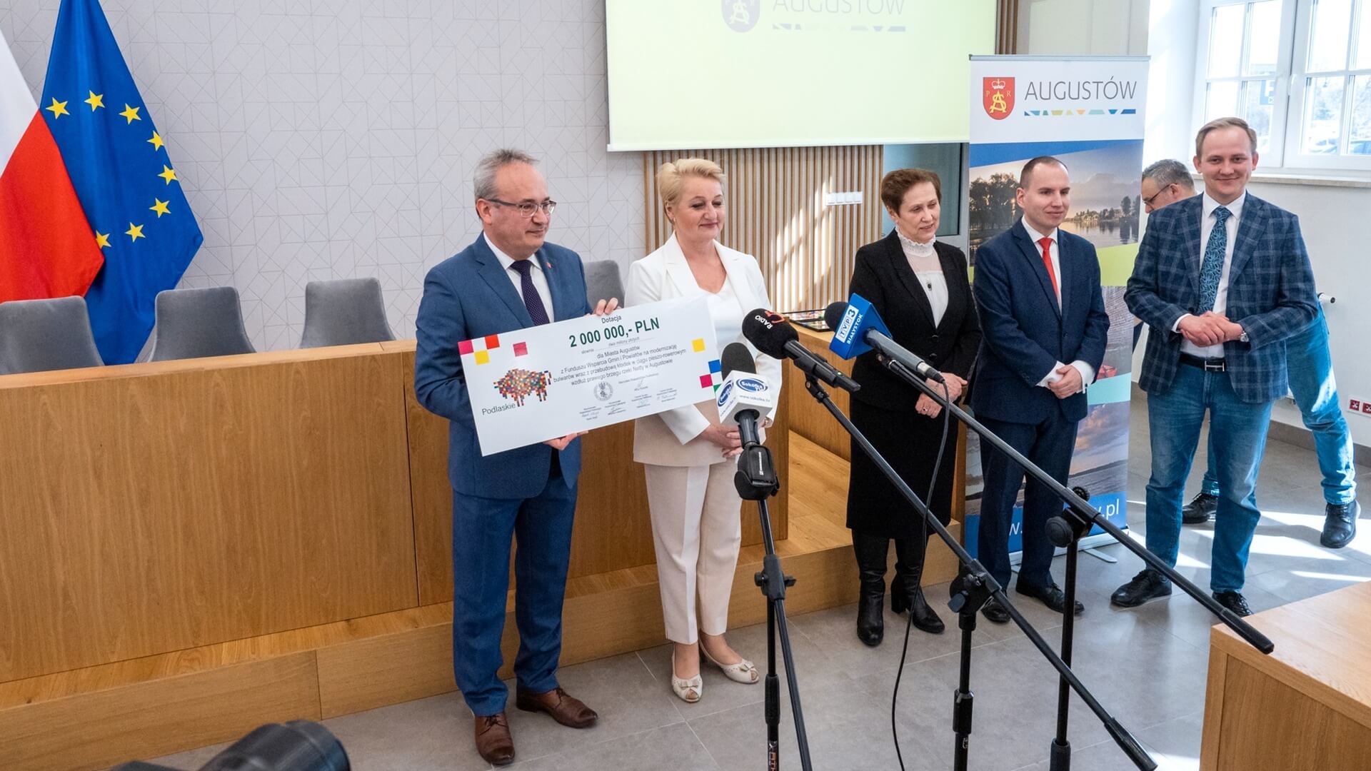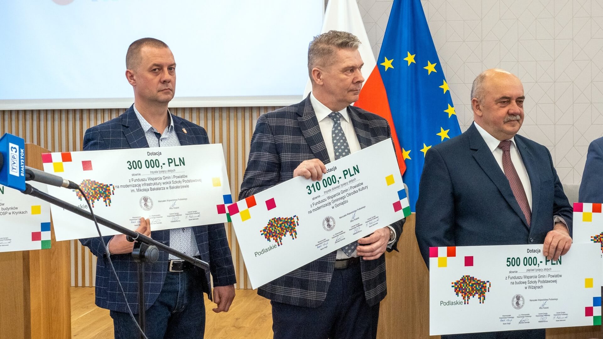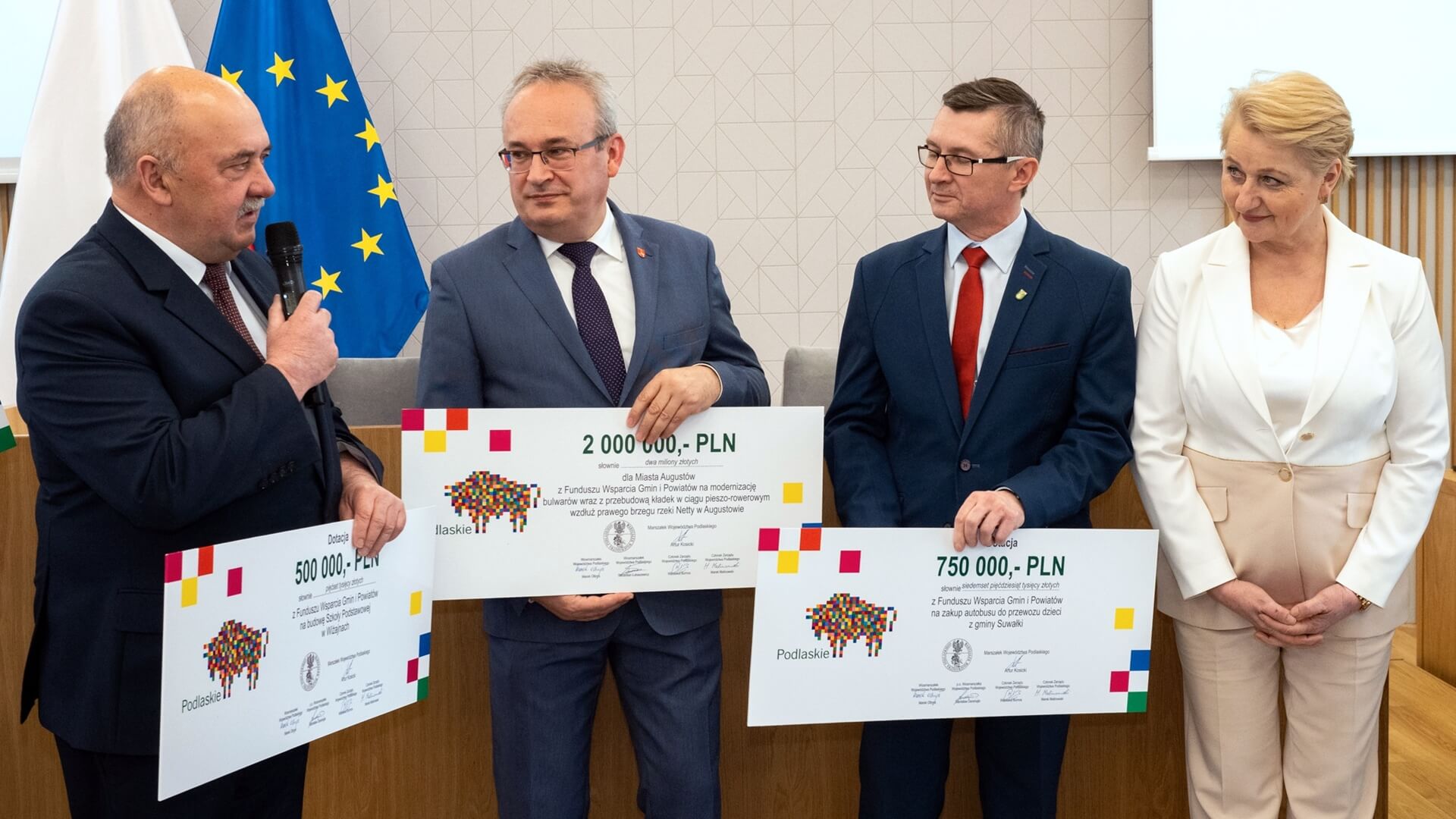 Symboliczne czeki z dofinansowaniem w ramach Funduszu Wsparcia Gmin i Powiatów z Urzędu Marszałkowskiego odebrali we wtorek (29.03) w Augustowie przedstawiciele 9 gmin z północnej części województwa.
