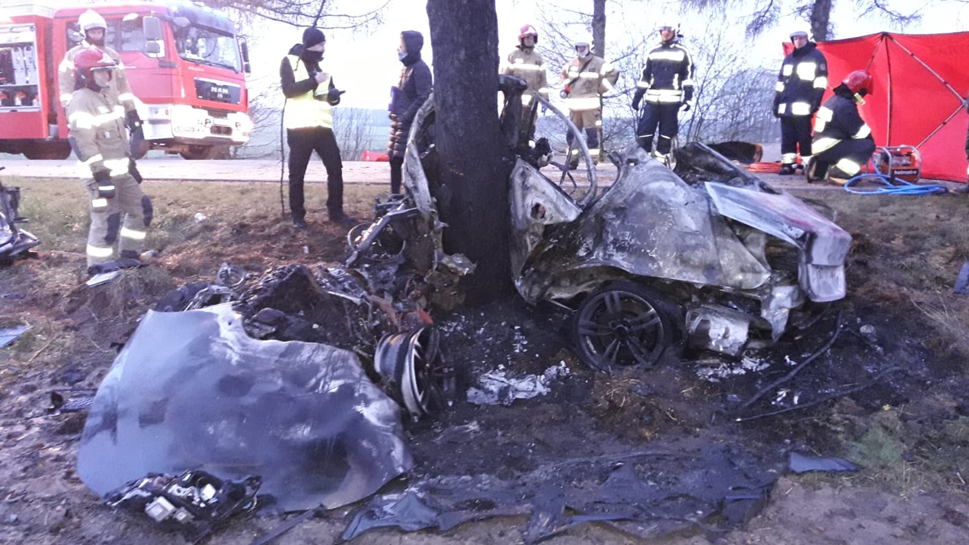 Kierowca BMW stracił panowanie nad autem i uderzył w drzewo. Doszło do pożaru.