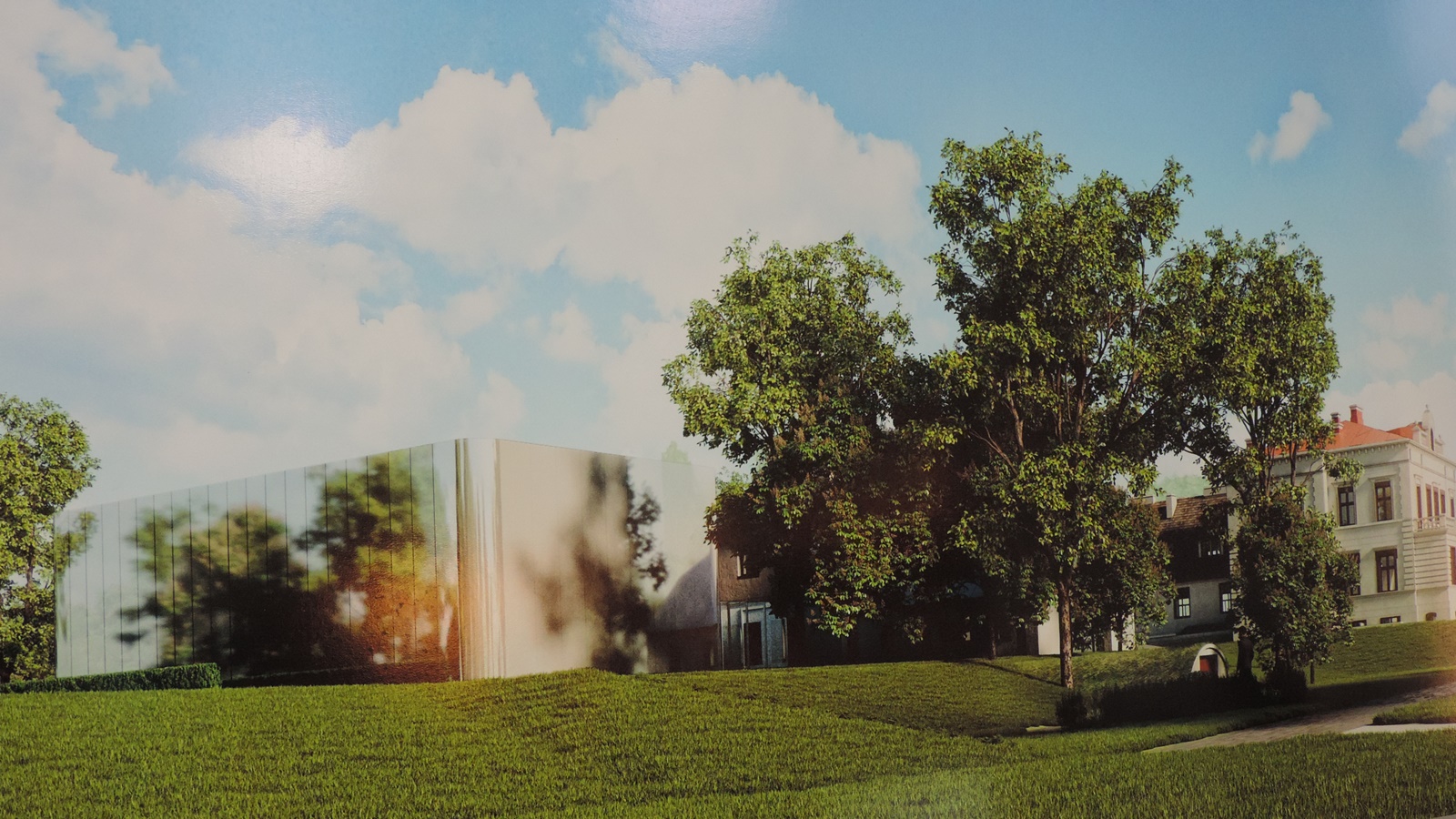 Nowy obiekt ma nowoczesny kształt, ale plany przewidują obłożenie jego elewacji lustrzanymi płytami, będzie więc czymś na kształt dworskiej oranżerii i doskonale koresponduje zarówno z zabytkowym dworem, jak i położonym między nimi ośrodkiem edukacji przyrodniczej.