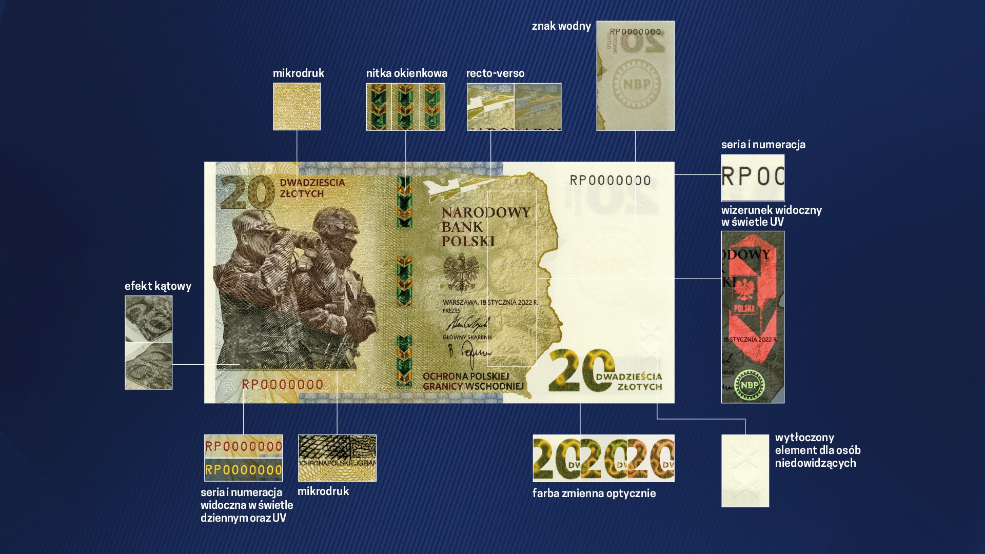 Na przedniej stronie banknotu są sylwetki funkcjonariusza Straży Granicznej i żołnierza Wojska Polskiego, a także fragment mapy Polski. Z drugiej strony jest wizerunek orła z polskiego godła, a także policyjny śmigłowiec na tle krajobrazu terenów przy wschodniej granicy Polski.