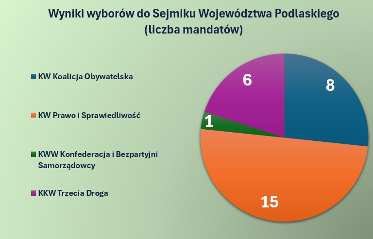 15 dla PiS, 8 dla Koalicji Obywatelskiej, 6 dla Trzeciej Drogi, jeden dla KWW Konfederacja i Bezpartyjni Samorządowcy - taki jest podział mandatów w wybranym w niedzielnych wyborach sejmiku województwa podlaskiego. Do samodzielnej większości PiS zabrakło jednego mandatu.
