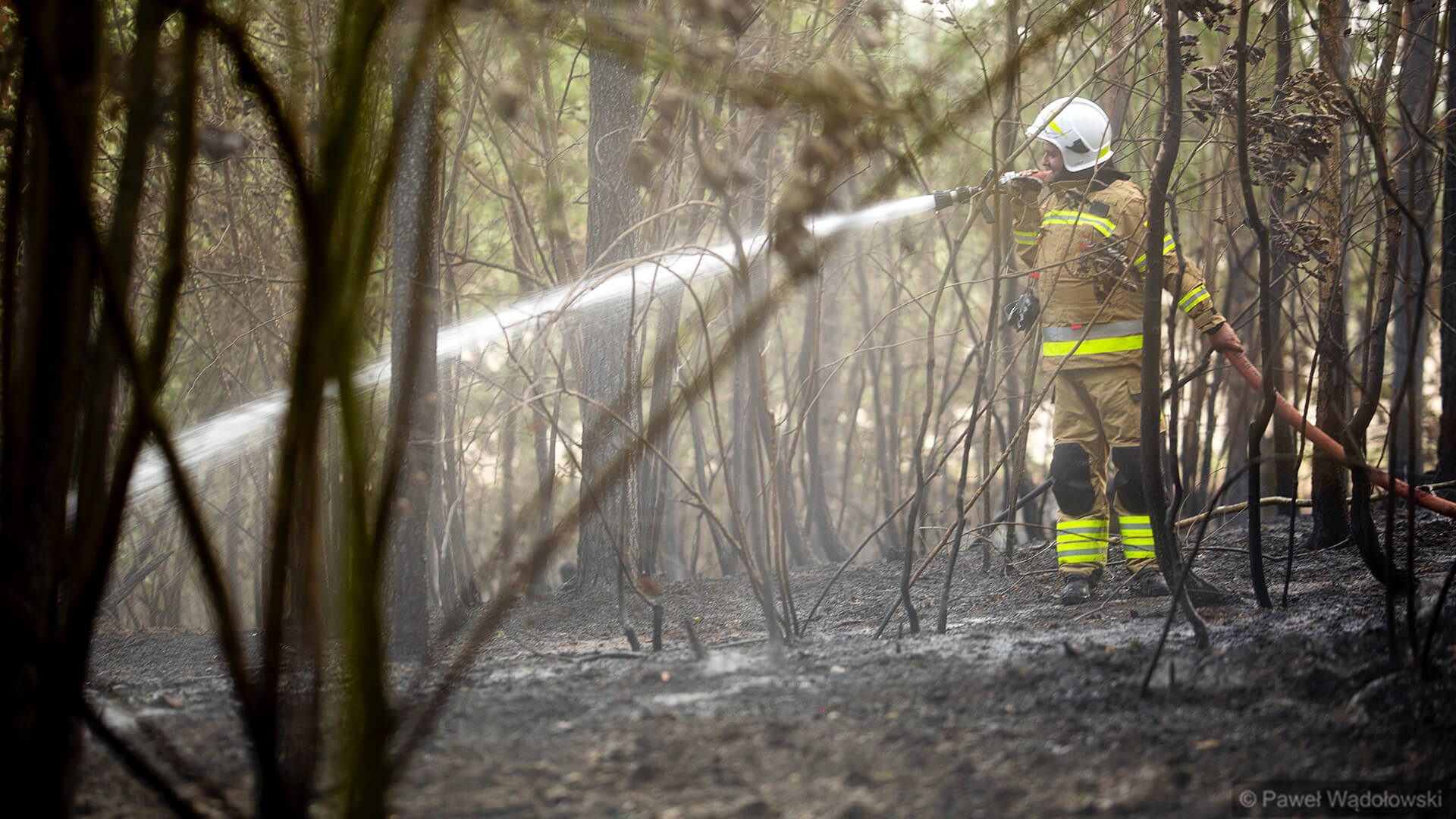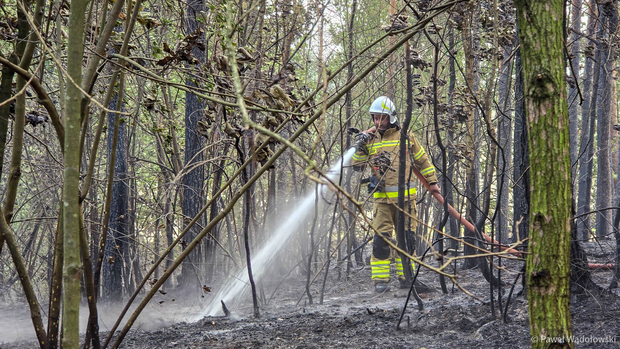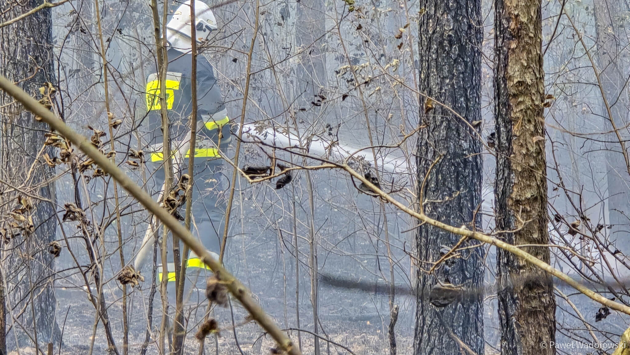 Część strażaków zostanie na pogorzelisku do rana. Muszą przelewać ściółkę, bo w wielu miejscach cały czas pojawia się ogień.