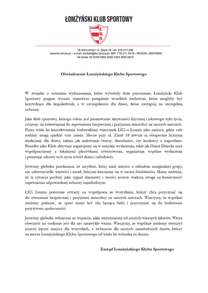 Po skierowanej do mediów odpowiedzi prezesa ŁKS-u Łomża i oświadczeniu kibiców, pojawiło się oficjalne stanowisko klubu w sprawie zachowania kibiców w niedzielę (27.10). Przypomnijmy, grupa 20-30 osób zablokowała wyjazd autokaru z 7-letnimi dziećmi na mecz Jagiellonii.