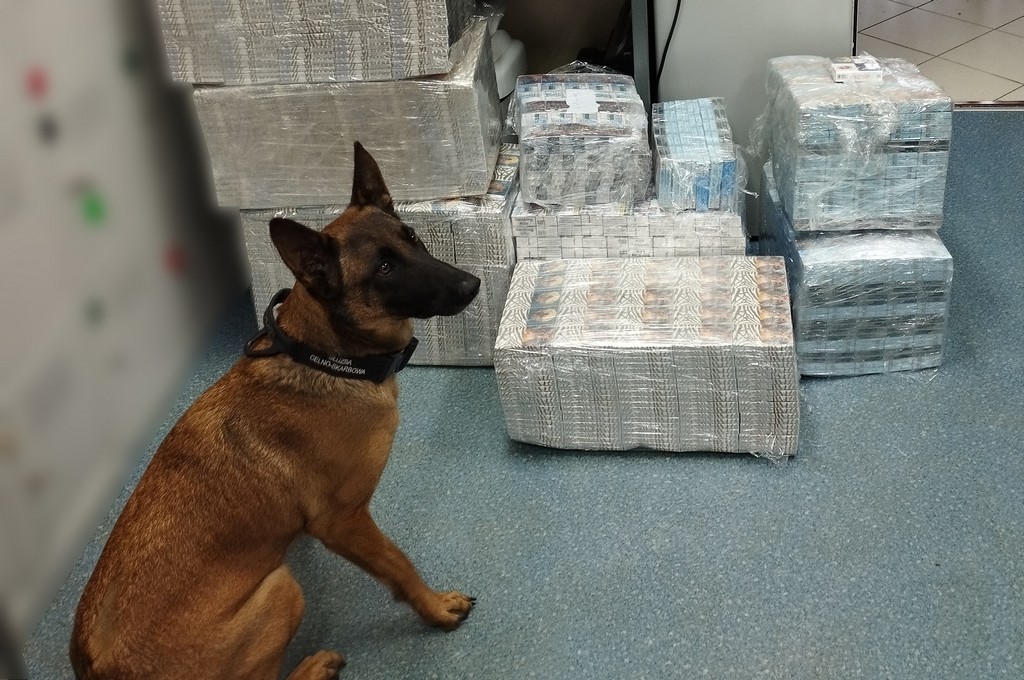Mundurowi przeszukali również dwie posesje w powiatach: sokólskim i augustowskim, gdzie 35-latek mógł przechowywać kontrabandę. Tam zabezpieczono kolejne 2500 paczek papierosów z białoruskim znakami akcyzy. W przeszukaniach pomagała Hiena, owczarek belgijski podlaskiej KAS wyszkolony do wykrywania wyrobów tytoniowych i waluty