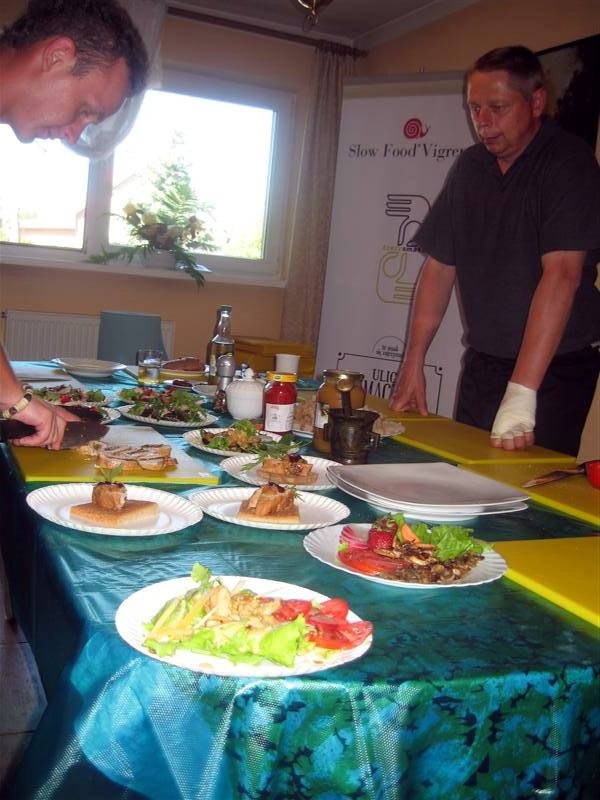 Podczas zajęć praktycznych tworzą dania, używając ekologicznych produktów. "Był jeden warunek - nie gotujemy tak jak w domu. Gotujemy to wszystko, czego normalnie w domu byśmy nie ugotowali" - mówi restaurator i pasjonata, szef Convivium Vigrensis Slow Food Polska Michał Grnyo.