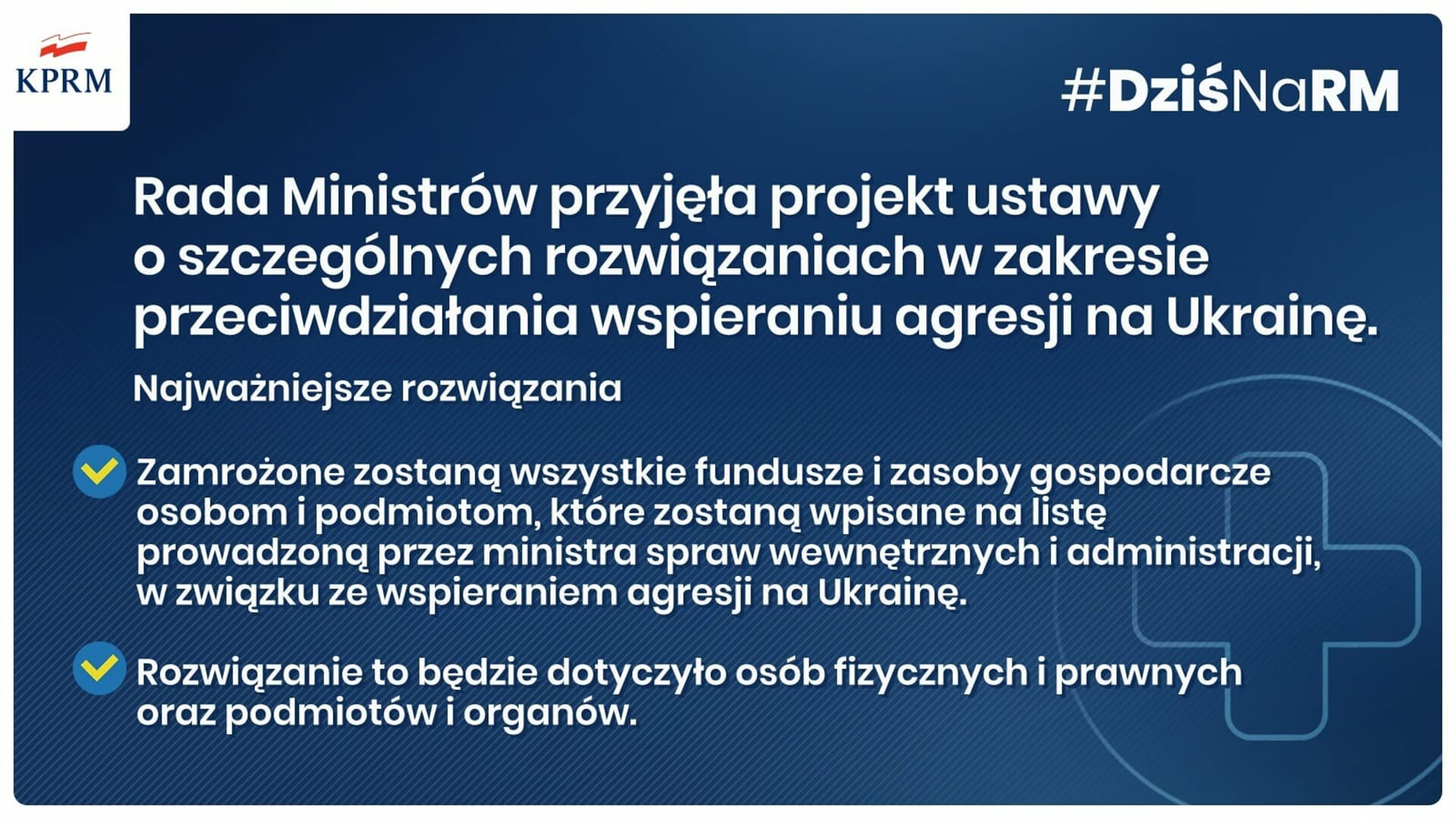 - Rada Ministrów zdecydowała się, aby przyjąć kolejny pakiet rozwiązań, który umożliwi podejmowanie działań w zakresie mrożenia funduszy na terenie Polski. Projekt ustawy zakłada, że będziemy blokować majątki podmiotów, które przyczyniają się do wspierania rosyjskiej inwazji na niepodległą Ukrainę - przekazał Piotr Müller.